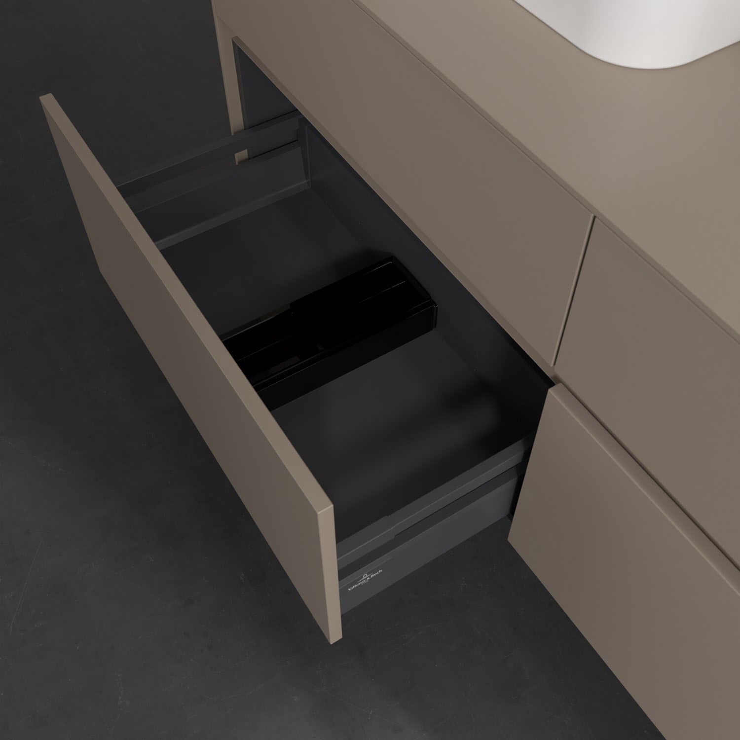 Stauraumwunder im zeitgemäßen Design: Der Villeroy & Boch Waschbeckenunterschrank aus der Collaro Kollektion eignet sich besonders für Familienbäder und bietet genau den Platz, der dort benötigt wird. Stimmungsvolles Highlight der schlichten, modernen Front ist die integrierte Griffmulde mit stufenlos einstellbarer LED-Beleuchtung. Im Inneren bietet das Möbelstück mit vier Auszügen erstaunlich viel Komfort – ermöglicht durch großzügiges Platzangebot und den integrierten Antirutschboden. Variabel setzbare Glasabtrennungen und mitgelieferte Accessory Boxen sorgen für den nötigen Überblick. Dank SoftClosing und Selbsteinzug lassen sich die Auszüge nach der Nutzung lautlos schließen. Die Front ist mit einer hochwertigen Lackierung versehen, deren Anti-Fingerprint-Oberfläche unschönen Fingerabdrücken vorbeugt.