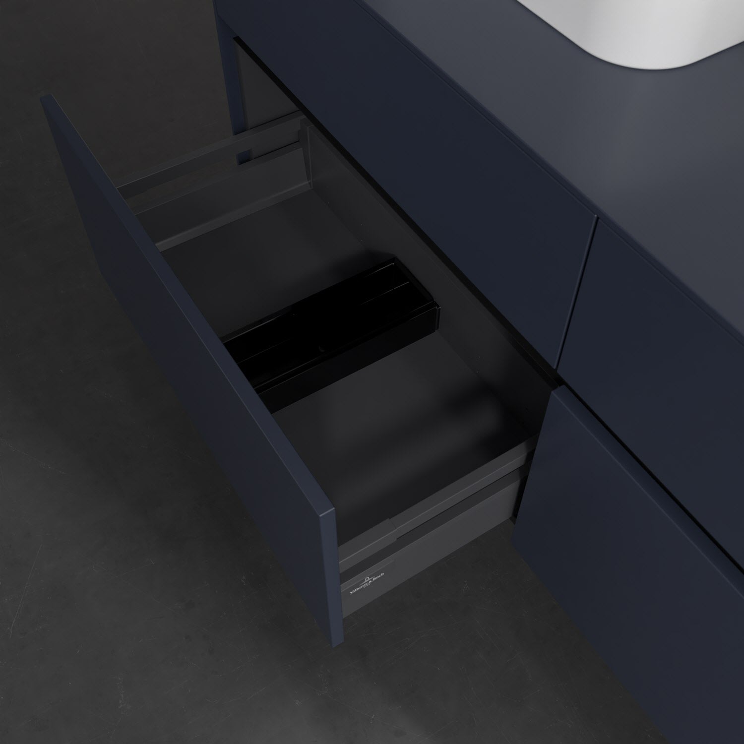 Stauraumwunder im zeitgemäßen Design: Der Villeroy & Boch Waschbeckenunterschrank aus der Collaro Kollektion eignet sich besonders für Familienbäder und bietet genau den Platz, der dort benötigt wird. Stimmungsvolles Highlight der schlichten, modernen Front ist die integrierte Griffmulde mit stufenlos einstellbarer LED-Beleuchtung. Im Inneren bietet das Möbelstück mit vier Auszügen erstaunlich viel Komfort – ermöglicht durch großzügiges Platzangebot und den integrierten Antirutschboden. Variabel setzbare Glasabtrennungen und mitgelieferte Accessory Boxen sorgen für den nötigen Überblick. Dank SoftClosing und Selbsteinzug lassen sich die Auszüge nach der Nutzung lautlos schließen. Die Front ist mit einer hochwertigen Lackierung versehen, deren Anti-Fingerprint-Oberfläche unschönen Fingerabdrücken vorbeugt.