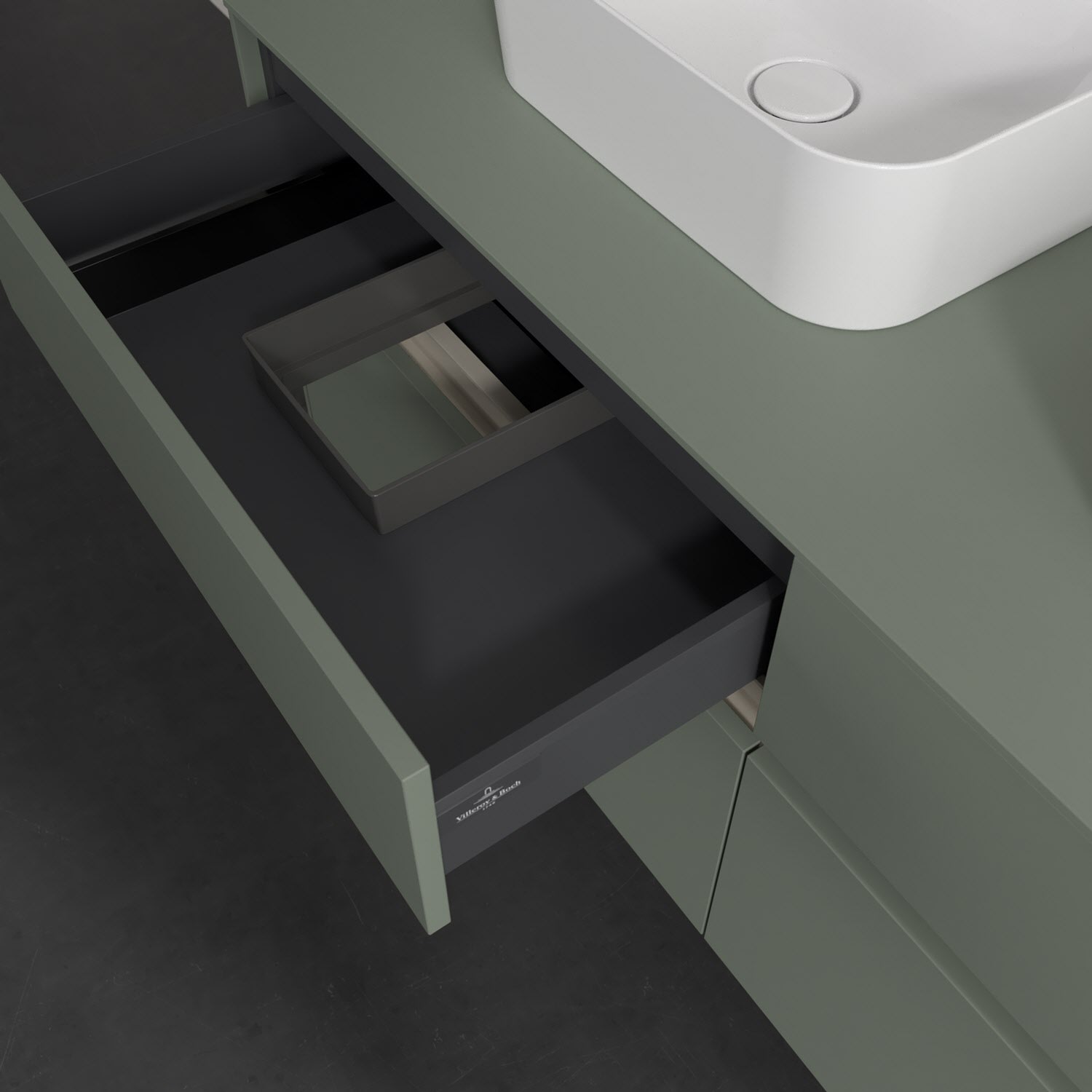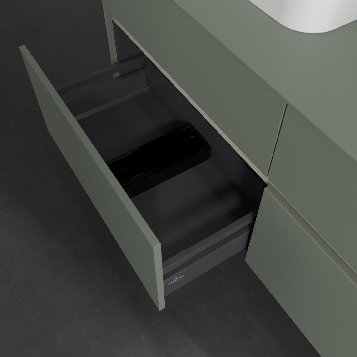 Stauraumwunder im zeitgemäßen Design: Der Villeroy & Boch Waschbeckenunterschrank aus der Collaro Kollektion eignet sich besonders für Familienbäder und bietet genau den Platz, der dort benötigt wird. Stimmungsvolles Highlight der schlichten, modernen Front ist die integrierte Griffmulde mit stufenlos einstellbarer LED-Beleuchtung. Im Inneren bietet das Möbelstück mit vier Auszügen erstaunlich viel Komfort – ermöglicht durch großzügiges Platzangebot und den integrierten Antirutschboden. Variabel setzbare Glasabtrennungen und mitgelieferte Accessory Boxen sorgen für den nötigen Überblick. Dank SoftClosing und Selbsteinzug lassen sich die Auszüge nach der Nutzung lautlos schließen. Die Front ist mit einer hochwertigen Lackierung versehen, deren Anti-Fingerprint-Oberfläche unschönen Fingerabdrücken vorbeugt.