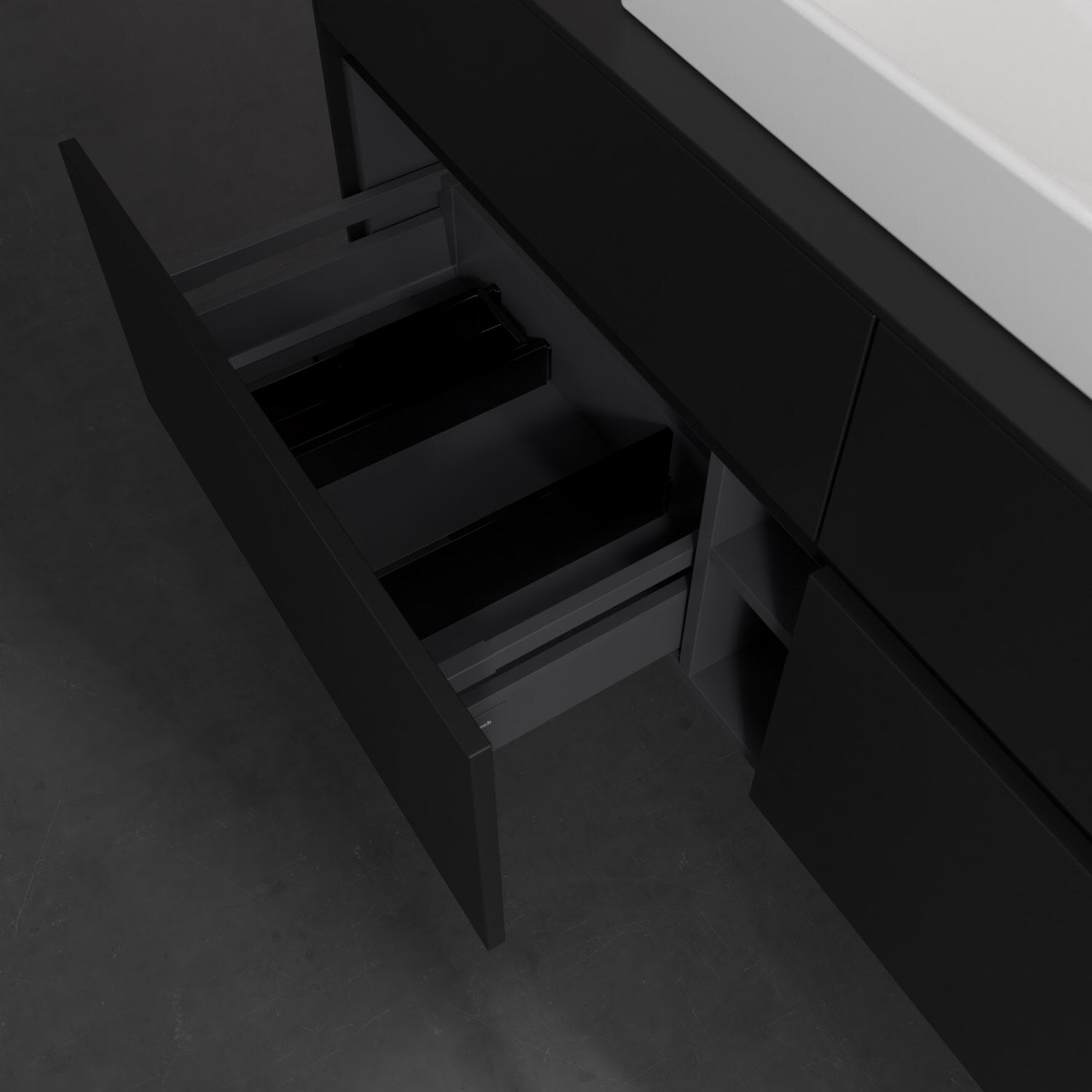 - kein Umfallen oder Verrutschen von Pflegeprodukten in den Schubladen dank rutschhemmendem Boden