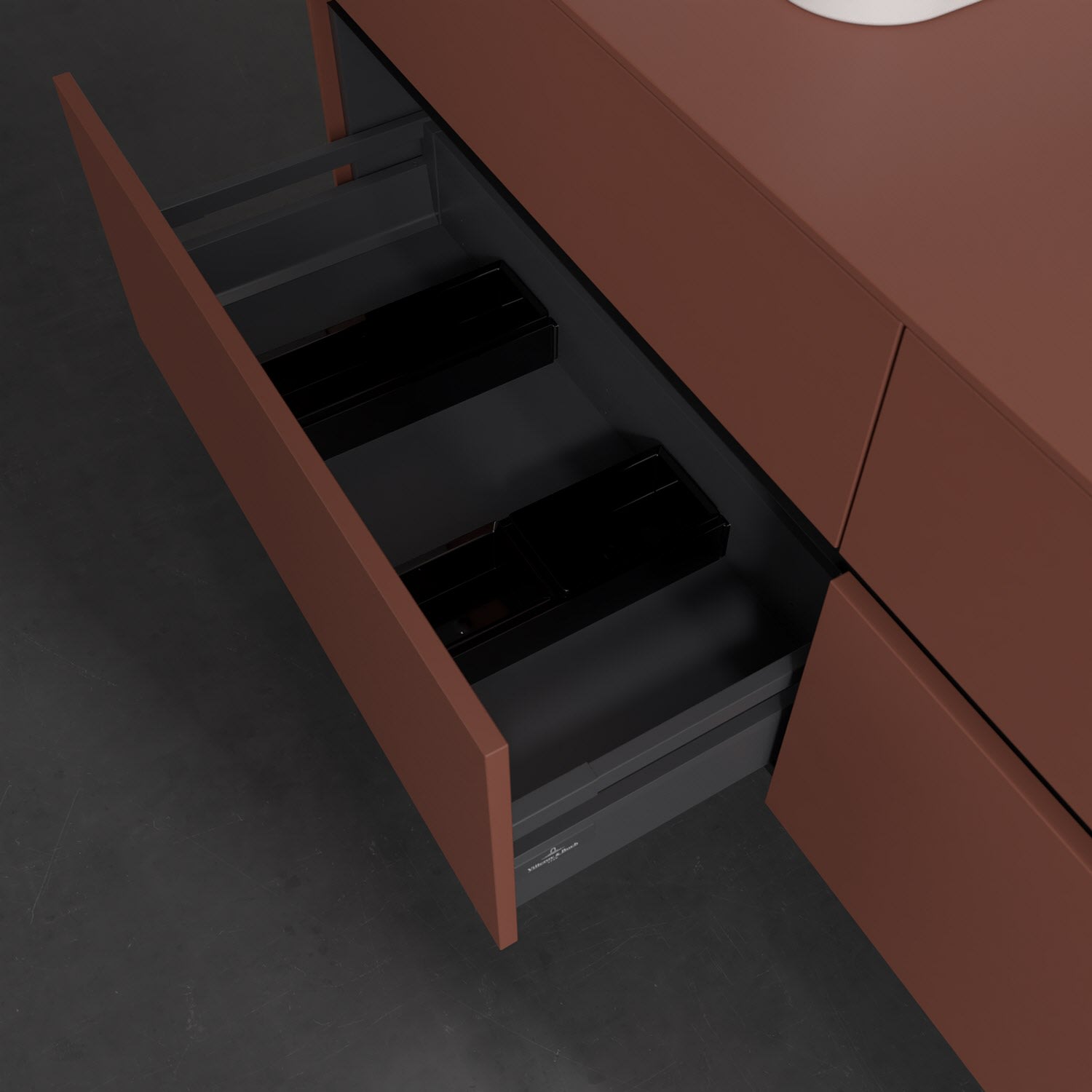 Stauraumwunder im zeitgemäßen Design: Der Villeroy & Boch Waschbeckenunterschrank aus der Collaro Kollektion eignet sich besonders für Familienbäder und bietet genau den Platz, der dort benötigt wird. Stimmungsvolles Highlight der schlichten, modernen Front ist die integrierte Griffmulde mit stufenlos einstellbarer LED-Beleuchtung. Im Inneren bietet das Möbelstück mit vier Auszügen erstaunlich viel Komfort – ermöglicht durch großzügiges Platzangebot und den integrierten Antirutschboden. Variabel setzbare Glasabtrennungen und mitgelieferte Accessory Boxen sorgen für den nötigen Überblick. Dank SoftClosing und Selbsteinzug lassen sich die Auszüge nach der Nutzung lautlos schließen. Die Front ist mit einer hochwertigen Lackierung versehen, deren Anti-Fingerprint-Oberfläche unschönen Fingerabdrücken vorbeugt.
