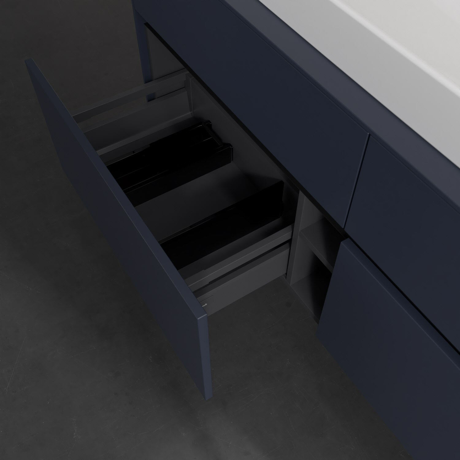 - kein Umfallen oder Verrutschen von Pflegeprodukten in den Schubladen dank rutschhemmendem Boden