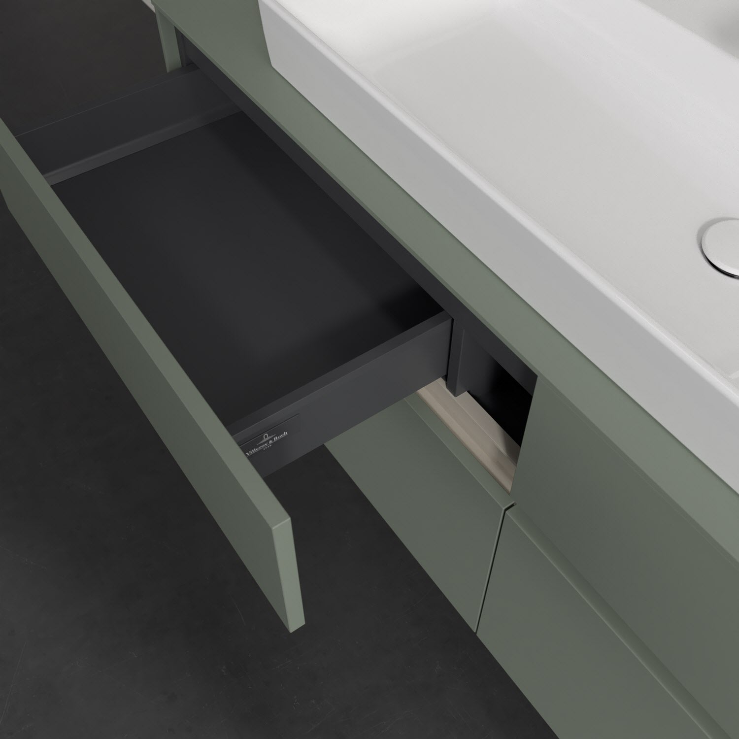 Stauraumwunder im zeitgemäßen Design: Der Villeroy & Boch Waschbeckenunterschrank aus der Collaro Kollektion eignet sich besonders für Familienbäder und bietet genau den Platz, der dort benötigt wird. Stimmungsvolles Highlight der schlichten, modernen Front ist die integrierte Griffmulde mit stufenlos einstellbarer LED-Beleuchtung. Im Inneren bietet das Möbelstück mit vier Auszügen erstaunlich viel Komfort – ermöglicht durch großzügiges Platzangebot und den integrierten Antirutschboden. Variabel setzbare Glasabtrennungen und mitgelieferte Accessory Boxen sorgen für den nötigen Überblick. Dank SoftClosing und Selbsteinzug lassen sich die Auszüge nach der Nutzung lautlos schließen. Die Front ist mit einer hochwertigen Lackierung versehen, deren Anti-Fingerprint-Oberfläche unschönen Fingerabdrücken vorbeugt.