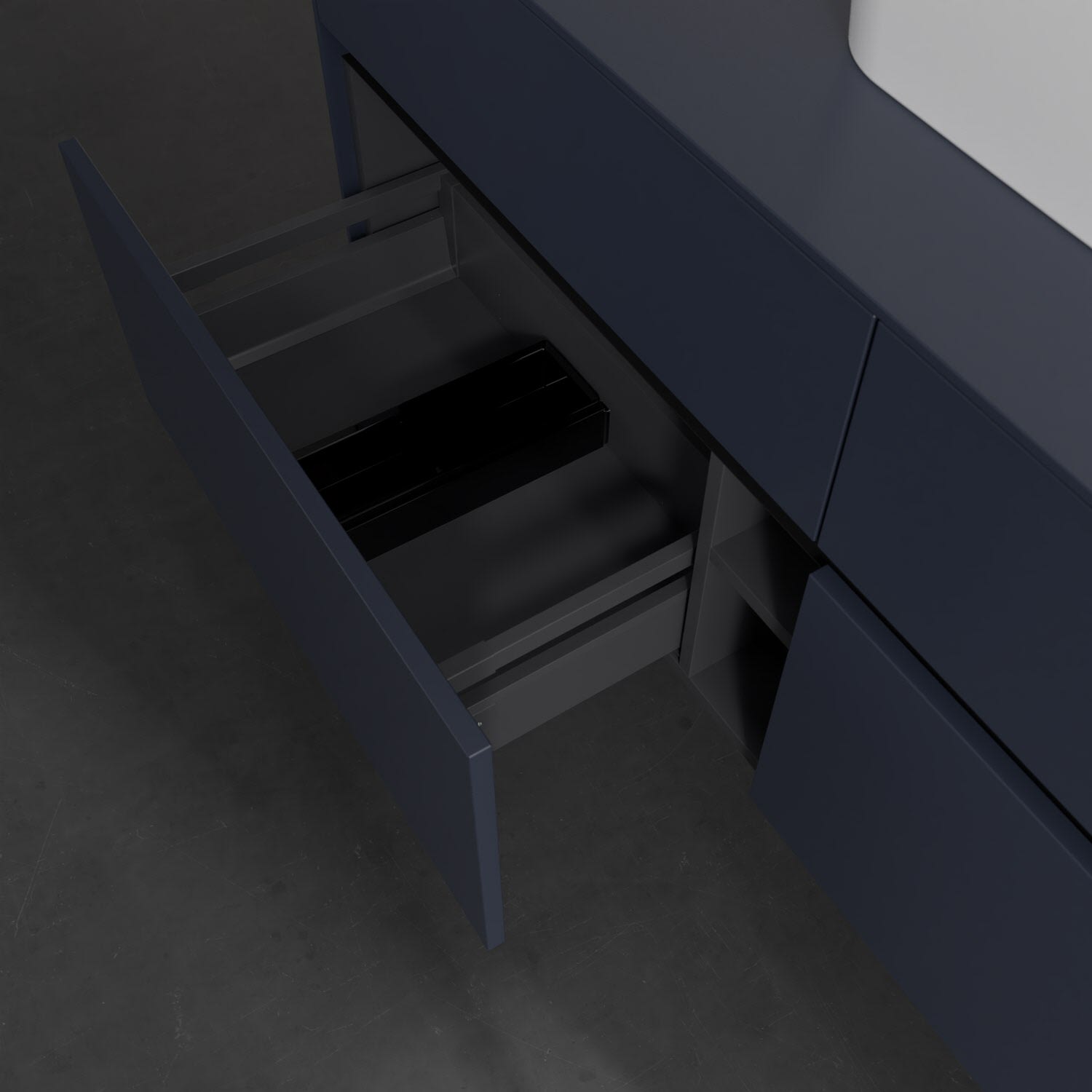 Stauraumwunder im zeitgemäßen Design: Der Villeroy & Boch Waschbeckenunterschrank aus der Collaro Kollektion eignet sich besonders für Familienbäder und bietet genau den Platz, der dort benötigt wird. Stimmungsvolles Highlight der schlichten, modernen Front ist die integrierte Griffmulde mit stufenlos einstellbarer LED-Beleuchtung. Im Inneren bietet das Möbelstück mit vier Auszügen erstaunlich viel Komfort – ermöglicht durch großzügiges Platzangebot und den integrierten Antirutschboden. Variabel setzbare Glasabtrennungen und mitgelieferte Accessory Boxen sorgen für den nötigen Überblick. Dank SoftClosing und Selbsteinzug lassen sich die Auszüge nach der Nutzung lautlos schließen. Die Front ist mit einer hochwertigen Lackierung versehen, deren Anti-Fingerprint-Oberfläche unschönen Fingerabdrücken vorbeugt.