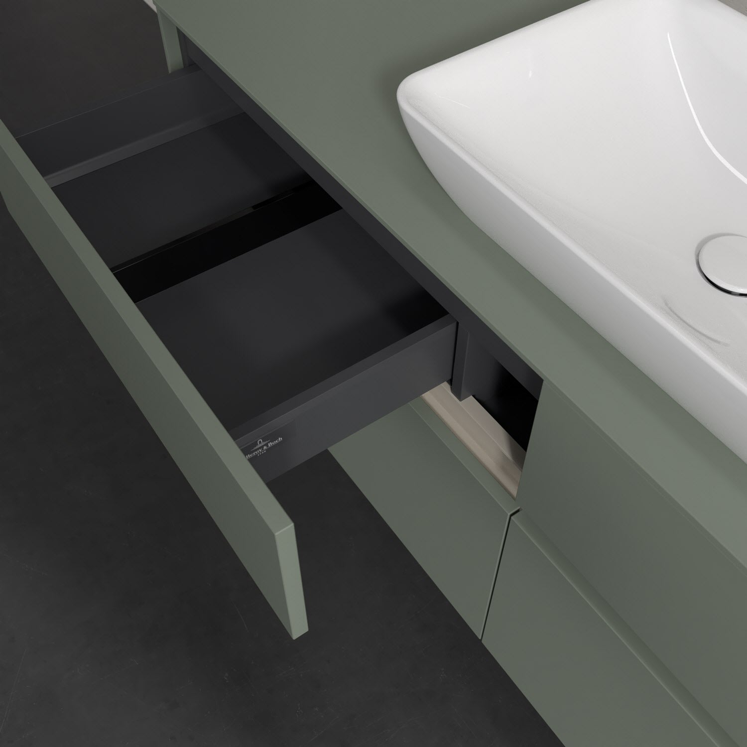 Stauraumwunder im zeitgemäßen Design: Der Villeroy & Boch Waschbeckenunterschrank aus der Collaro Kollektion eignet sich besonders für Familienbäder und bietet genau den Platz, der dort benötigt wird. Stimmungsvolles Highlight der schlichten, modernen Front ist die integrierte Griffmulde mit stufenlos einstellbarer LED-Beleuchtung. Im Inneren bietet das Möbelstück mit vier Auszügen erstaunlich viel Komfort – ermöglicht durch großzügiges Platzangebot und den integrierten Antirutschboden. Variabel setzbare Glasabtrennungen und mitgelieferte Accessory Boxen sorgen für den nötigen Überblick. Dank SoftClosing und Selbsteinzug lassen sich die Auszüge nach der Nutzung lautlos schließen. Die Front ist mit einer hochwertigen Lackierung versehen, deren Anti-Fingerprint-Oberfläche unschönen Fingerabdrücken vorbeugt.