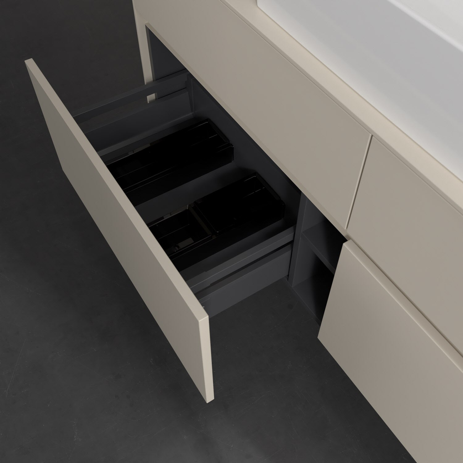 Stauraumwunder im zeitgemäßen Design: Der Villeroy & Boch Waschbeckenunterschrank aus der Collaro Kollektion eignet sich besonders für Familienbäder und bietet genau den Platz, der dort benötigt wird. Stimmungsvolles Highlight der schlichten, modernen Front ist die integrierte Griffmulde mit stufenlos einstellbarer LED-Beleuchtung. Im Inneren bietet das Möbelstück mit vier Auszügen erstaunlich viel Komfort – ermöglicht durch großzügiges Platzangebot und den integrierten Antirutschboden. Variabel setzbare Glasabtrennungen und mitgelieferte Accessory Boxen sorgen für den nötigen Überblick. Dank SoftClosing und Selbsteinzug lassen sich die Auszüge nach der Nutzung lautlos schließen. Die Front ist mit einer hochwertigen Lackierung versehen, deren Anti-Fingerprint-Oberfläche unschönen Fingerabdrücken vorbeugt.