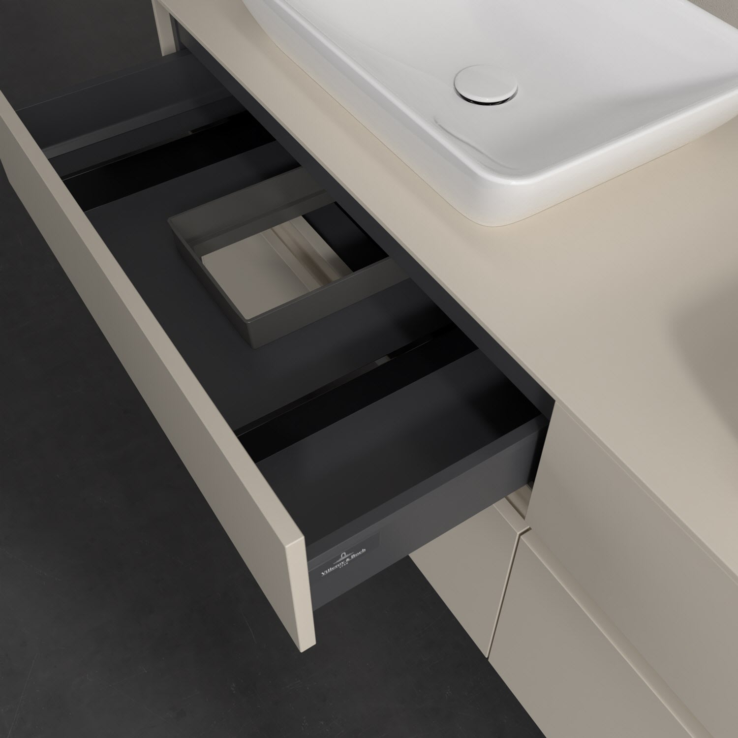 Stauraumwunder im zeitgemäßen Design: Der Villeroy & Boch Waschbeckenunterschrank aus der Collaro Kollektion eignet sich besonders für Familienbäder und bietet genau den Platz, der dort benötigt wird. Stimmungsvolles Highlight der schlichten, modernen Front ist die integrierte Griffmulde mit stufenlos einstellbarer LED-Beleuchtung. Im Inneren bietet das Möbelstück mit vier Auszügen erstaunlich viel Komfort – ermöglicht durch großzügiges Platzangebot und den integrierten Antirutschboden. Variabel setzbare Glasabtrennungen und mitgelieferte Accessory Boxen sorgen für den nötigen Überblick. Dank SoftClosing und Selbsteinzug lassen sich die Auszüge nach der Nutzung lautlos schließen. Die Front ist mit einer hochwertigen Lackierung versehen, deren Anti-Fingerprint-Oberfläche unschönen Fingerabdrücken vorbeugt.