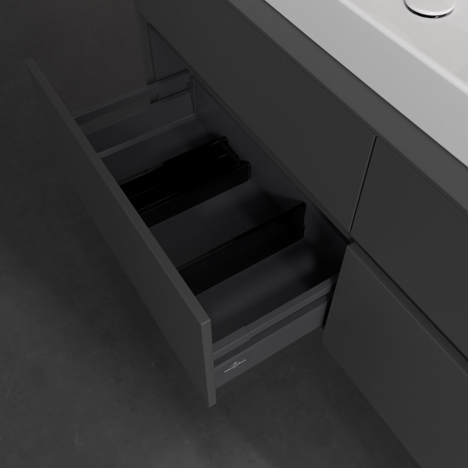 Stauraumwunder im zeitgemäßen Design: Der Villeroy & Boch Waschbeckenunterschrank aus der Collaro Kollektion eignet sich besonders für Familienbäder und bietet genau den Platz, der dort benötigt wird. Stimmungsvolles Highlight der schlichten, modernen Front ist die integrierte Griffmulde mit stufenlos einstellbarer LED-Beleuchtung. Im Inneren bietet das Möbelstück mit vier Auszügen erstaunlich viel Komfort – ermöglicht durch großzügiges Platzangebot und den integrierten Antirutschboden. Variabel setzbare Glasabtrennungen und mitgelieferte Accessory Boxen sorgen für den nötigen Überblick. Dank SoftClosing und Selbsteinzug lassen sich die Auszüge nach der Nutzung lautlos schließen. Die Front ist mit einer hochwertigen Lackierung versehen, deren Anti-Fingerprint-Oberfläche unschönen Fingerabdrücken vorbeugt.