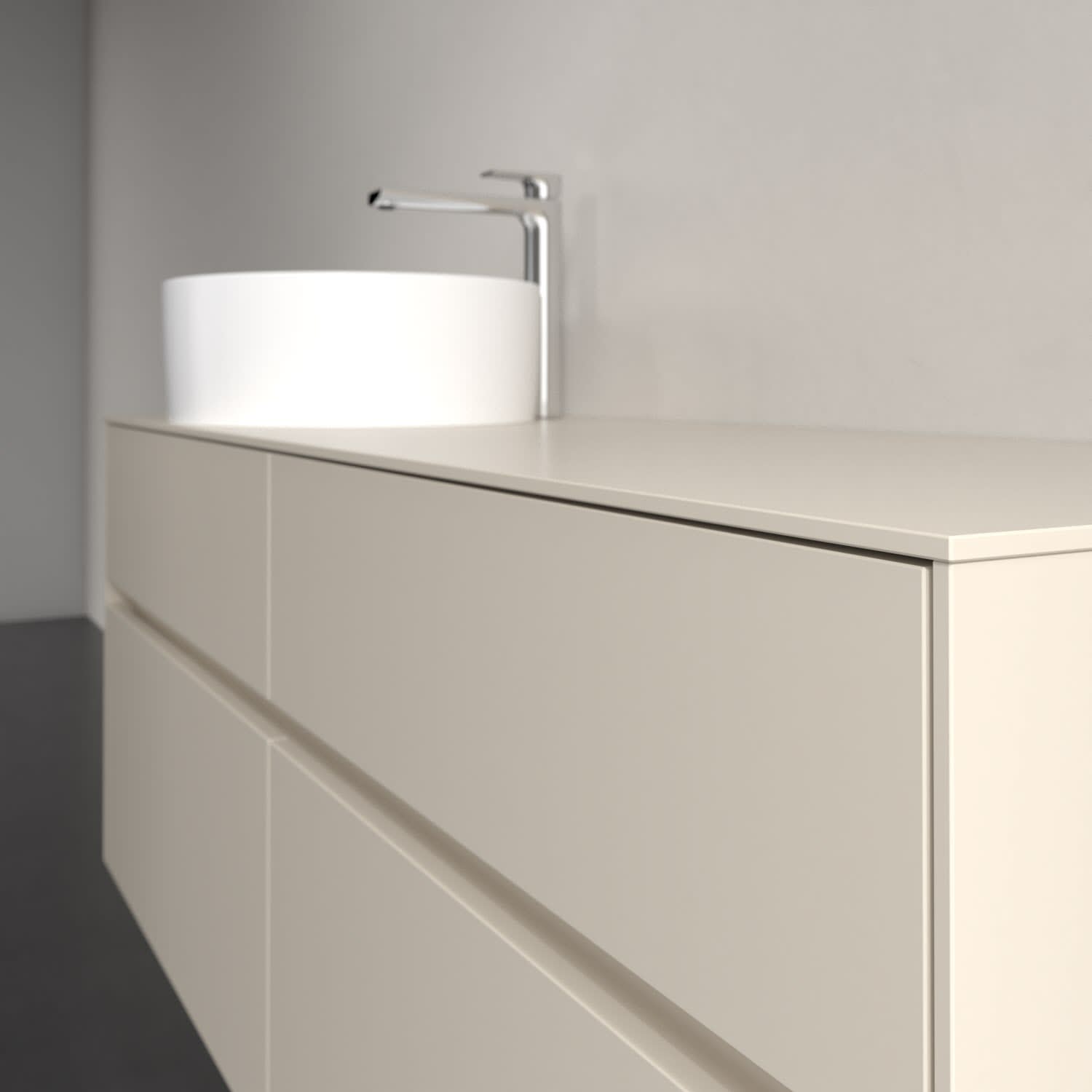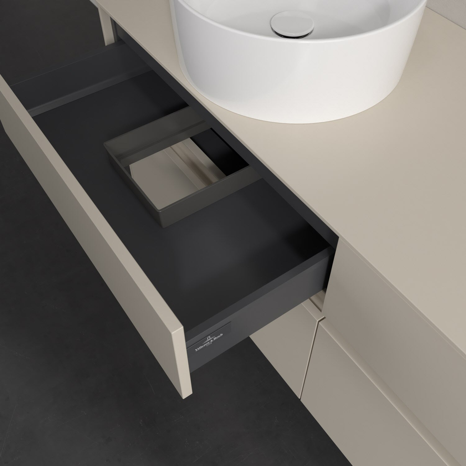 Stauraumwunder im zeitgemäßen Design: Der Villeroy & Boch Waschbeckenunterschrank aus der Collaro Kollektion eignet sich besonders für Familienbäder und bietet genau den Platz, der dort benötigt wird. Eine integrierte Griffleiste sorgt für eine schlichte, moderne Front. Im Inneren bietet das Möbelstück mit vier Auszügen erstaunlich viel Komfort – ermöglicht durch großzügiges Platzangebot und den integrierten Antirutschboden. Variabel setzbare Glasabtrennungen und mitgelieferte Accessory Boxen sorgen für den nötigen Überblick. Dank SoftClosing und Selbsteinzug lassen sich die Auszüge nach der Nutzung lautlos schließen. Die Front ist mit einer hochwertigen Lackierung versehen, deren Anti-Fingerprint-Oberfläche unschönen Fingerabdrücken vorbeugt.