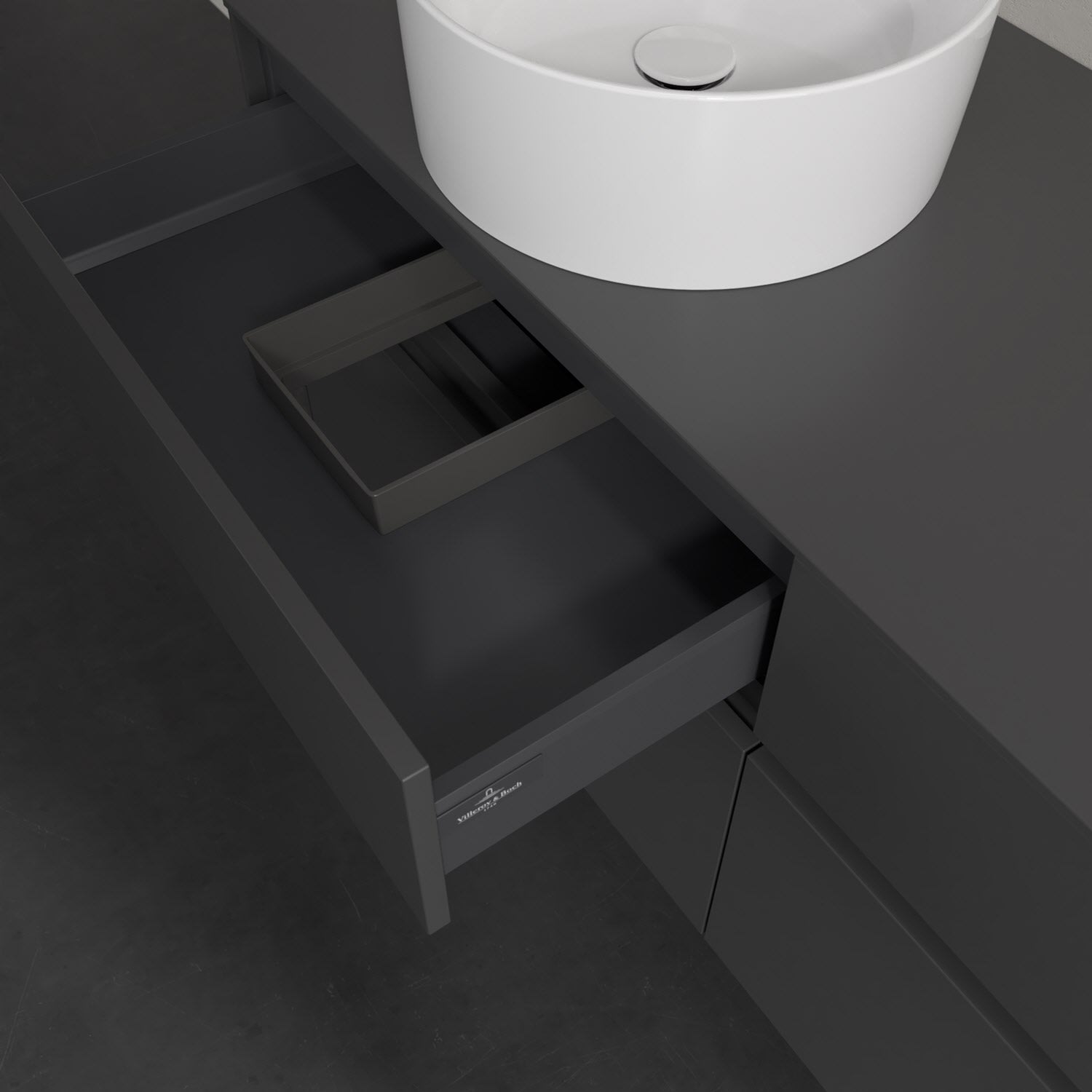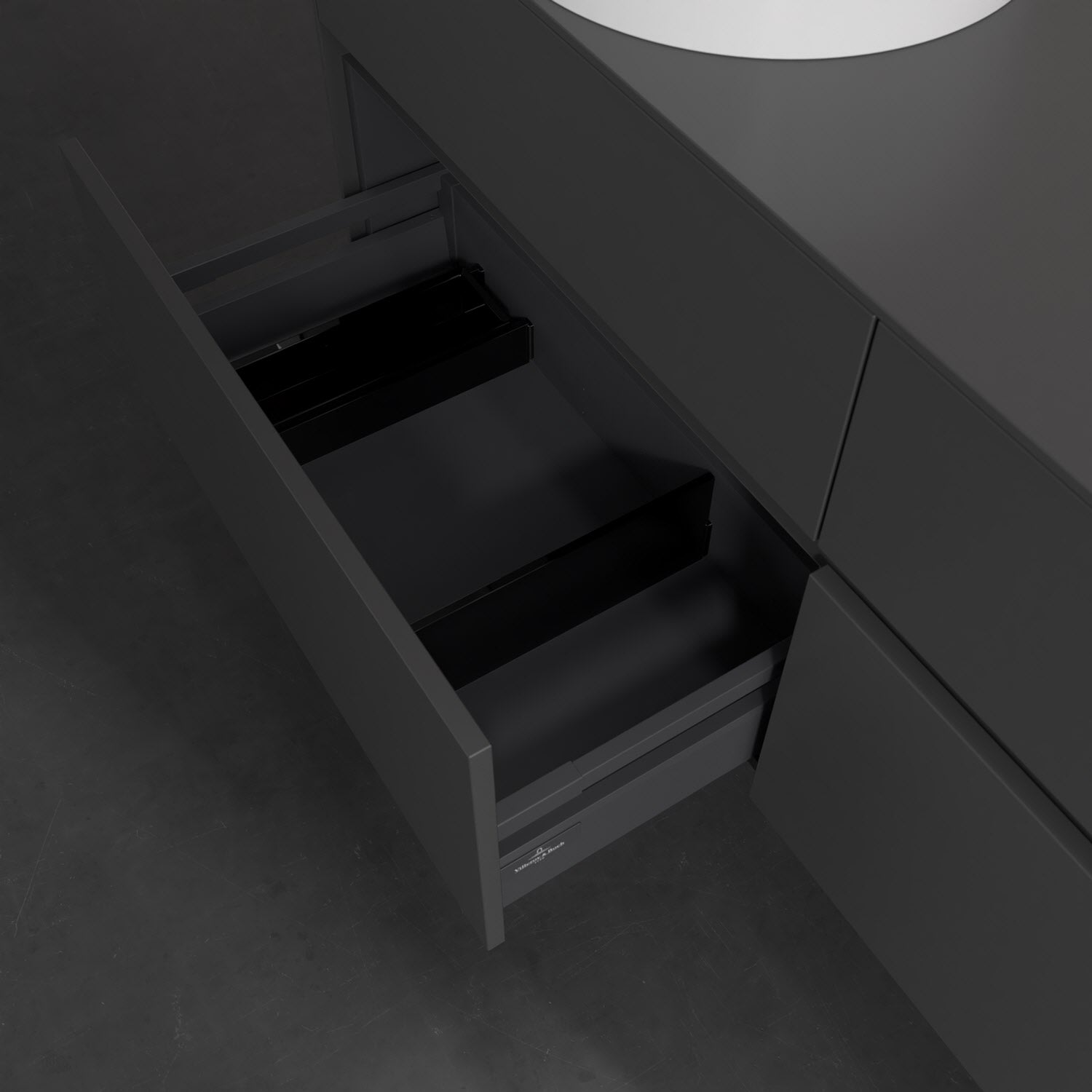 Stauraumwunder im zeitgemäßen Design: Der Villeroy & Boch Waschbeckenunterschrank aus der Collaro Kollektion eignet sich besonders für Familienbäder und bietet genau den Platz, der dort benötigt wird. Eine integrierte Griffleiste sorgt für eine schlichte, moderne Front. Im Inneren bietet das Möbelstück mit vier Auszügen erstaunlich viel Komfort – ermöglicht durch großzügiges Platzangebot und den integrierten Antirutschboden. Variabel setzbare Glasabtrennungen und mitgelieferte Accessory Boxen sorgen für den nötigen Überblick. Dank SoftClosing und Selbsteinzug lassen sich die Auszüge nach der Nutzung lautlos schließen. Die Front ist mit einer hochwertigen Lackierung versehen, deren Anti-Fingerprint-Oberfläche unschönen Fingerabdrücken vorbeugt.