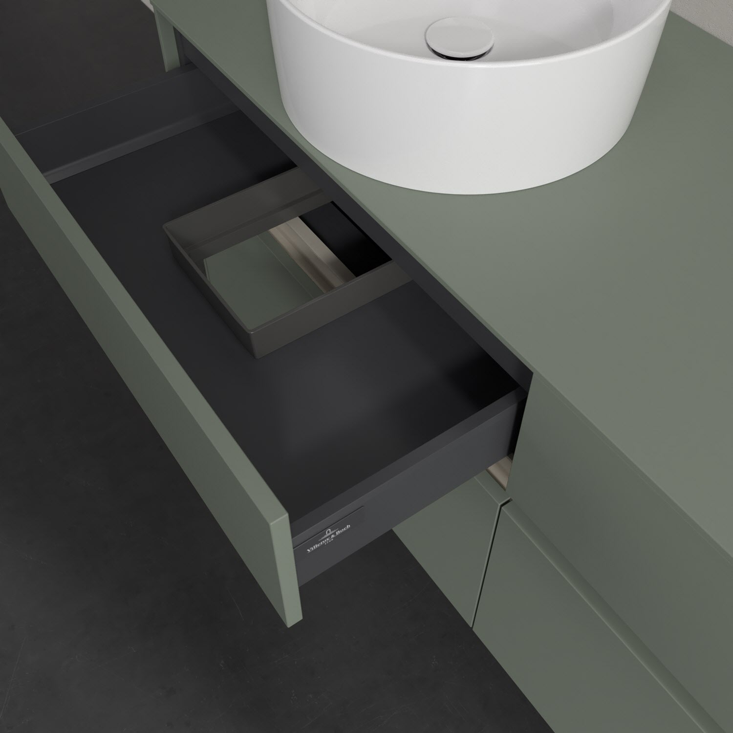 Stauraumwunder im zeitgemäßen Design: Der Villeroy & Boch Waschbeckenunterschrank aus der Collaro Kollektion eignet sich besonders für Familienbäder und bietet genau den Platz, der dort benötigt wird. Stimmungsvolles Highlight der schlichten, modernen Front ist die integrierte Griffmulde mit stufenlos einstellbarer LED-Beleuchtung. Steuern lässt sie sich über einen Touch-Sensor seitlich am Unterschrank. Im Inneren bietet das Möbelstück mit vier Auszügen erstaunlich viel Komfort – ermöglicht durch großzügiges Platzangebot und den integrierten Antirutschboden. Variabel setzbare Glasabtrennungen und mitgelieferte Accessory Boxen sorgen für den nötigen Überblick. Dank SoftClosing und Selbsteinzug lassen sich die Auszüge nach der Nutzung lautlos schließen. Die Front ist mit einer hochwertigen Lackierung versehen, deren Anti-Fingerprint-Oberfläche unschönen Fingerabdrücken vorbeugt.