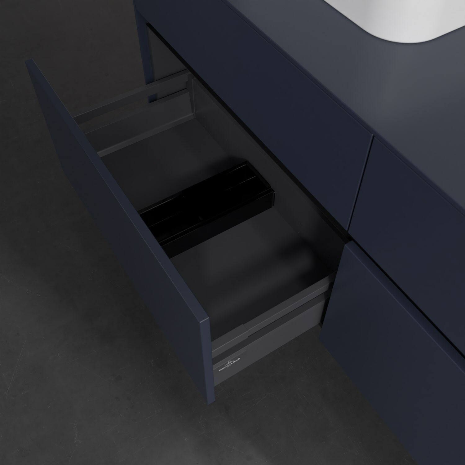 Stauraumwunder im zeitgemäßen Design: Der Villeroy & Boch Waschbeckenunterschrank aus der Collaro Kollektion eignet sich besonders für Familienbäder und bietet genau den Platz, der dort benötigt wird. Stimmungsvolles Highlight der schlichten, modernen Front ist die integrierte Griffmulde mit stufenlos einstellbarer LED-Beleuchtung. Im Inneren bietet das Möbelstück mit vier Auszügen erstaunlich viel Komfort – ermöglicht durch großzügiges Platzangebot und den integrierten Antirutschboden. Variabel setzbare Glasabtrennungen und mitgelieferte Accessory Boxen sorgen für den nötigen Überblick. Dank SoftClosing und Selbsteinzug lassen sich die Auszüge nach der Nutzung lautlos schließen. Die Front ist mit einer hochwertigen Lackierung versehen, deren Anti-Fingerprint-Oberfläche unschönen Fingerabdrücken vorbeugt.