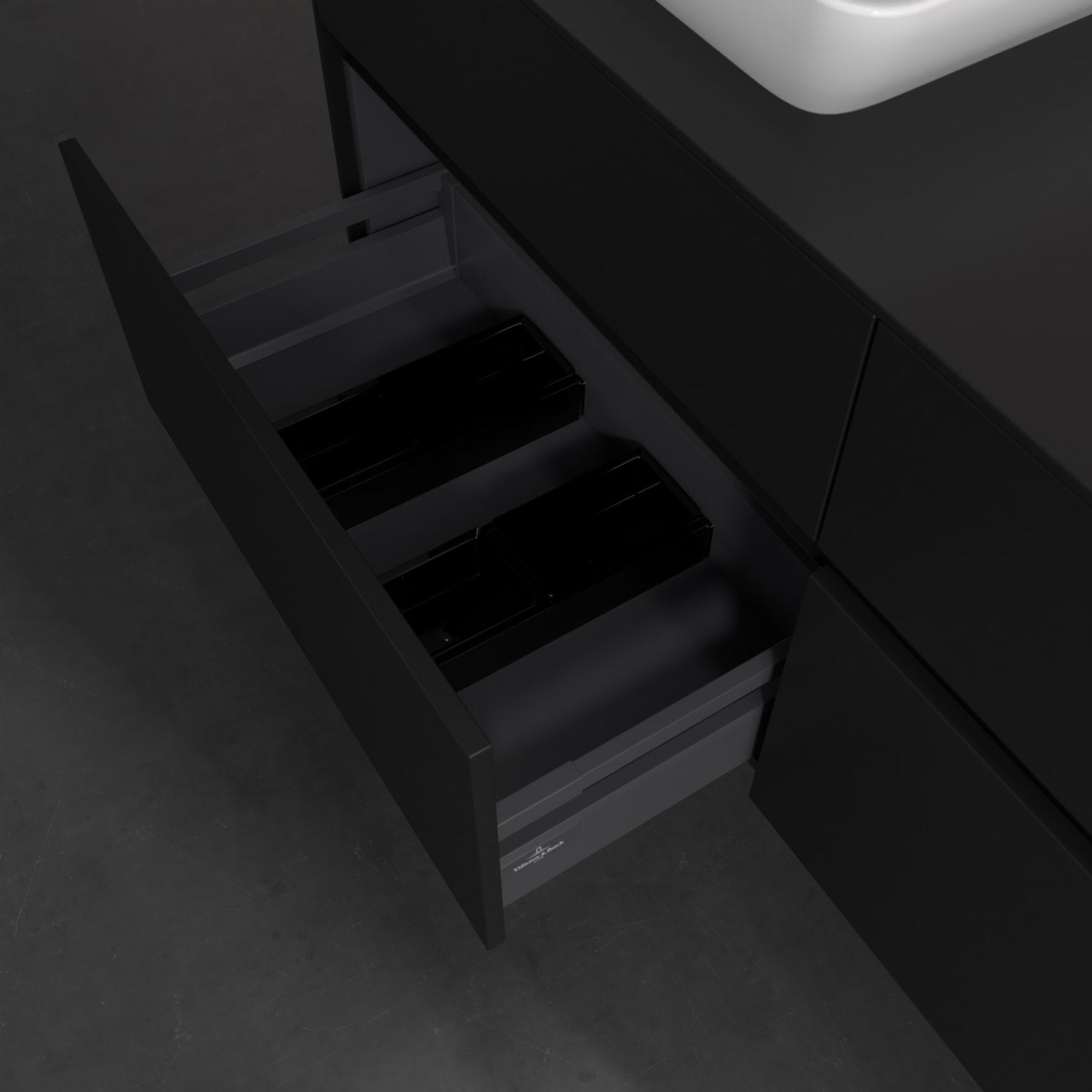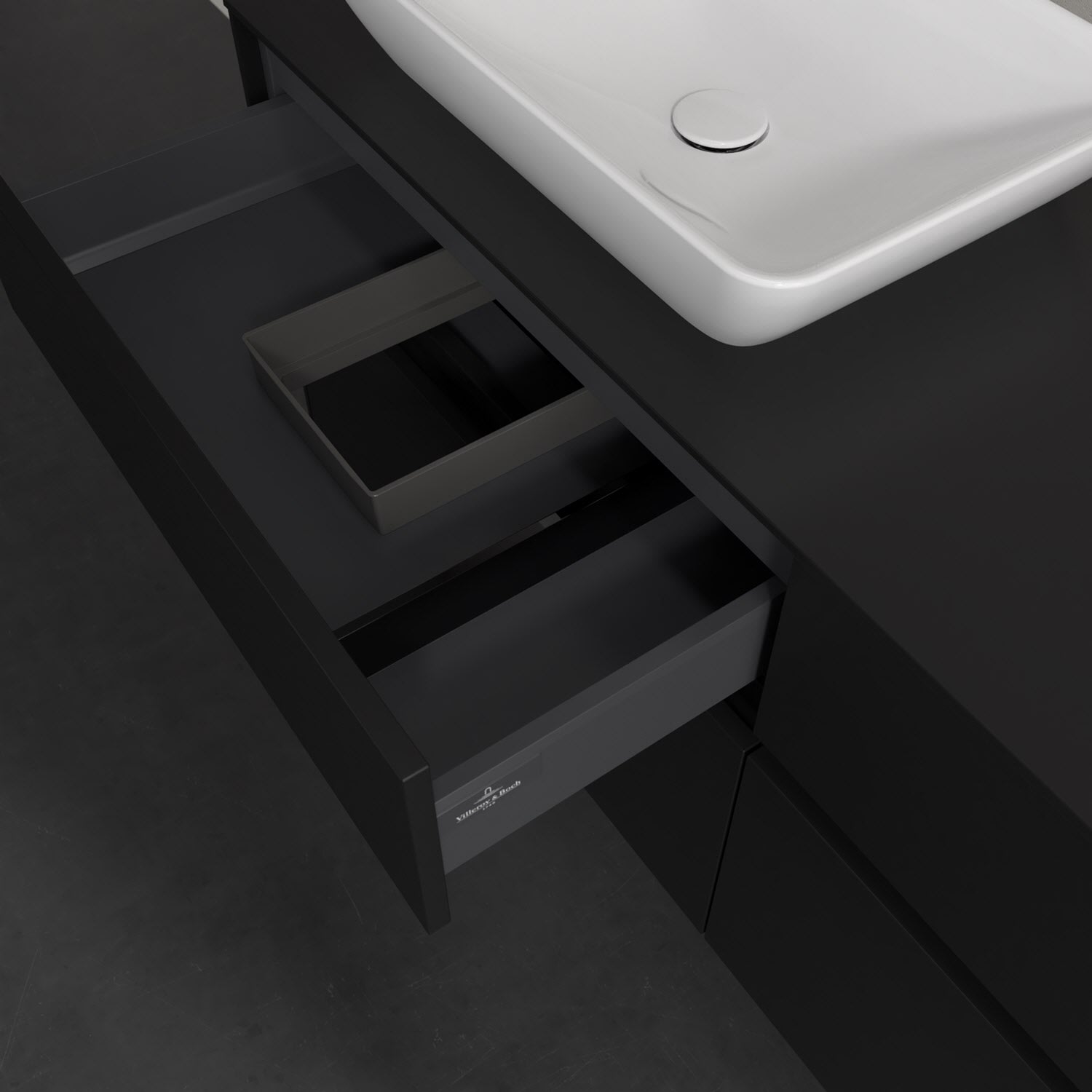 Stauraumwunder im zeitgemäßen Design: Der Villeroy & Boch Waschbeckenunterschrank aus der Collaro Kollektion eignet sich besonders für Familienbäder und bietet genau den Platz, der dort benötigt wird. Stimmungsvolles Highlight der schlichten, modernen Front ist die integrierte Griffmulde mit stufenlos einstellbarer LED-Beleuchtung. Im Inneren bietet das Möbelstück mit vier Auszügen erstaunlich viel Komfort – ermöglicht durch großzügiges Platzangebot und den integrierten Antirutschboden. Variabel setzbare Glasabtrennungen und mitgelieferte Accessory Boxen sorgen für den nötigen Überblick. Dank SoftClosing und Selbsteinzug lassen sich die Auszüge nach der Nutzung lautlos schließen. Die Front ist mit einer hochwertigen Lackierung versehen, deren Anti-Fingerprint-Oberfläche unschönen Fingerabdrücken vorbeugt.