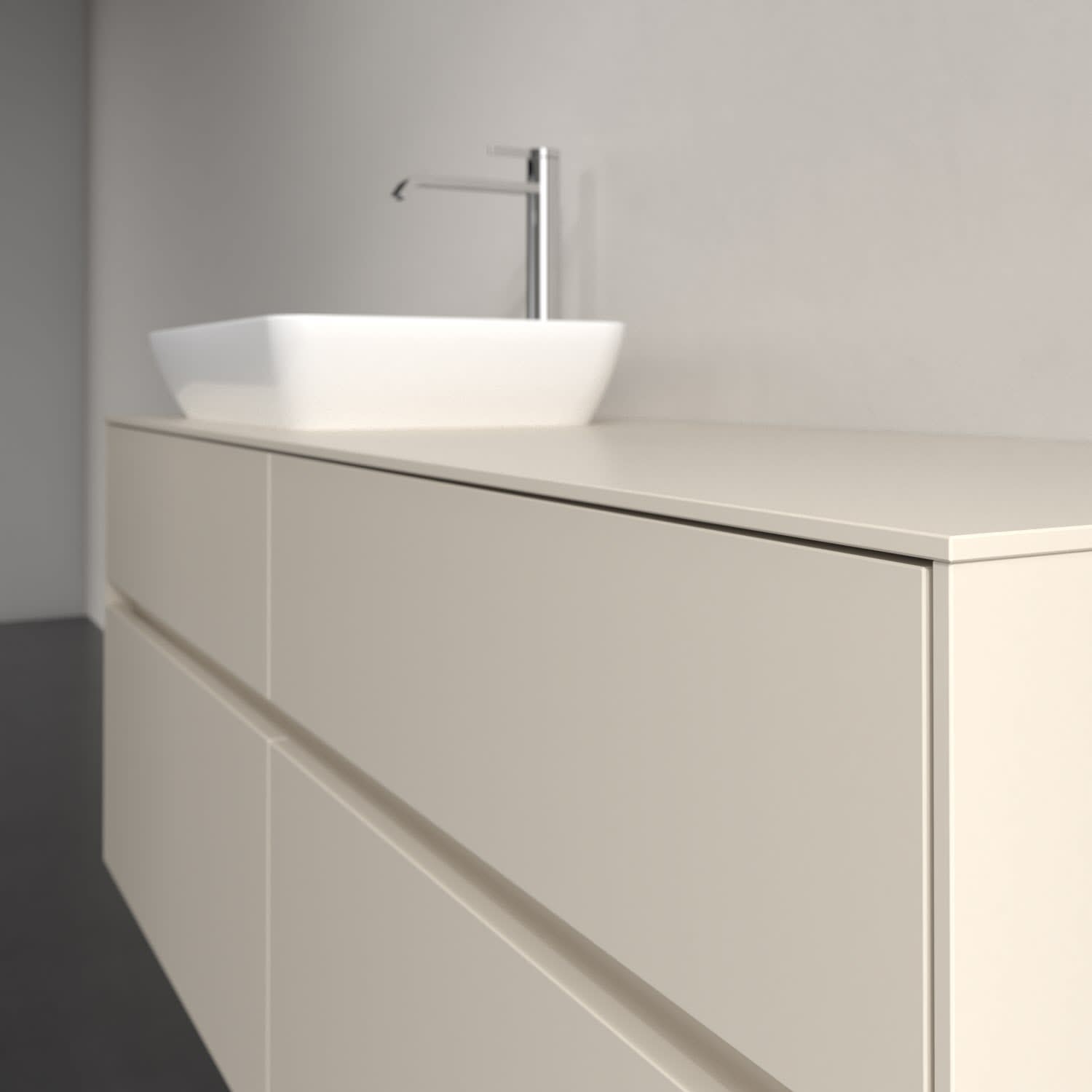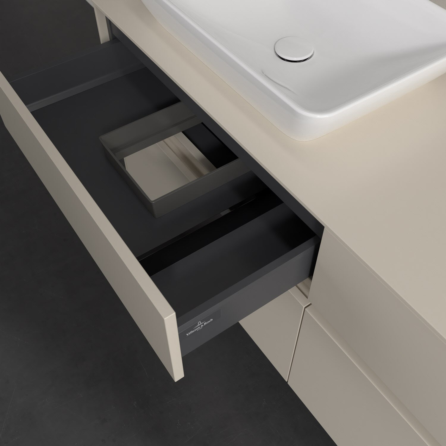 Stauraumwunder im zeitgemäßen Design: Der Villeroy & Boch Waschbeckenunterschrank aus der Collaro Kollektion eignet sich besonders für Familienbäder und bietet genau den Platz, der dort benötigt wird. Stimmungsvolles Highlight der schlichten, modernen Front ist die integrierte Griffmulde mit stufenlos einstellbarer LED-Beleuchtung. Im Inneren bietet das Möbelstück mit vier Auszügen erstaunlich viel Komfort – ermöglicht durch großzügiges Platzangebot und den integrierten Antirutschboden. Variabel setzbare Glasabtrennungen und mitgelieferte Accessory Boxen sorgen für den nötigen Überblick. Dank SoftClosing und Selbsteinzug lassen sich die Auszüge nach der Nutzung lautlos schließen. Die Front ist mit einer hochwertigen Lackierung versehen, deren Anti-Fingerprint-Oberfläche unschönen Fingerabdrücken vorbeugt.
