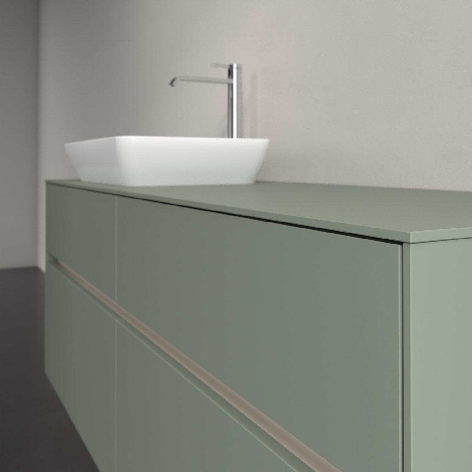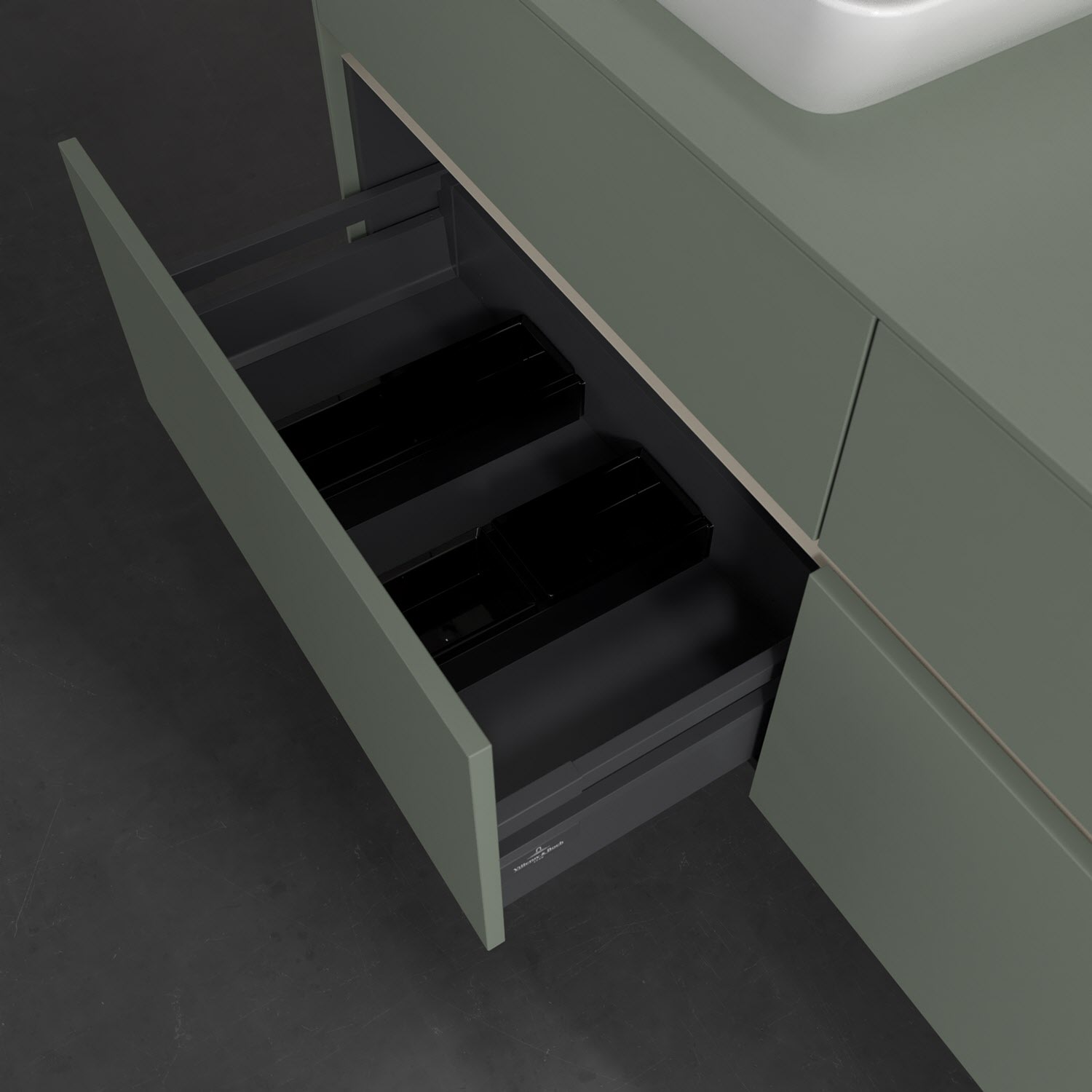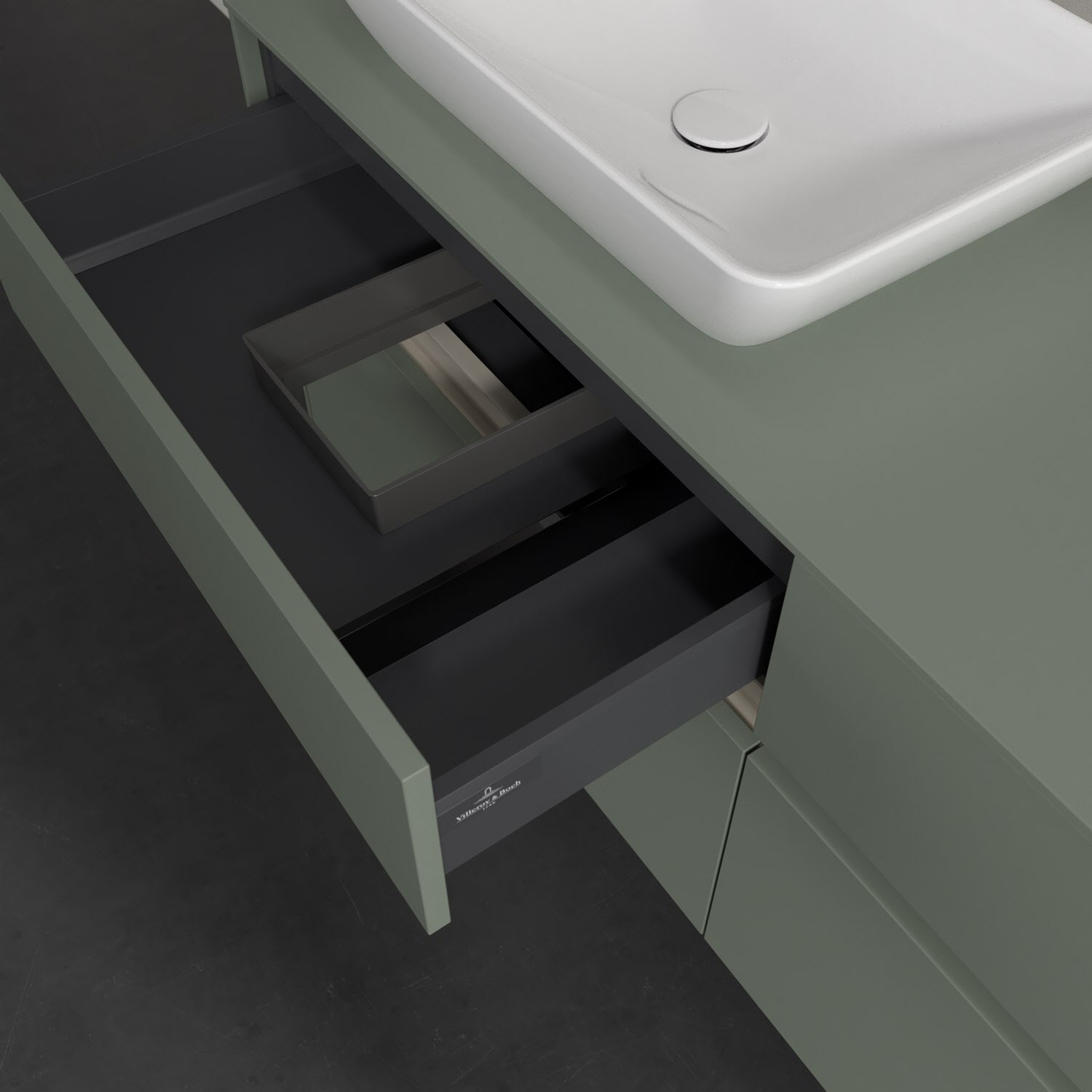 Stauraumwunder im zeitgemäßen Design: Der Villeroy & Boch Waschbeckenunterschrank aus der Collaro Kollektion eignet sich besonders für Familienbäder und bietet genau den Platz, der dort benötigt wird. Stimmungsvolles Highlight der schlichten, modernen Front ist die integrierte Griffmulde mit stufenlos einstellbarer LED-Beleuchtung. Im Inneren bietet das Möbelstück mit vier Auszügen erstaunlich viel Komfort – ermöglicht durch großzügiges Platzangebot und den integrierten Antirutschboden. Variabel setzbare Glasabtrennungen und mitgelieferte Accessory Boxen sorgen für den nötigen Überblick. Dank SoftClosing und Selbsteinzug lassen sich die Auszüge nach der Nutzung lautlos schließen. Die Front ist mit einer hochwertigen Lackierung versehen, deren Anti-Fingerprint-Oberfläche unschönen Fingerabdrücken vorbeugt.