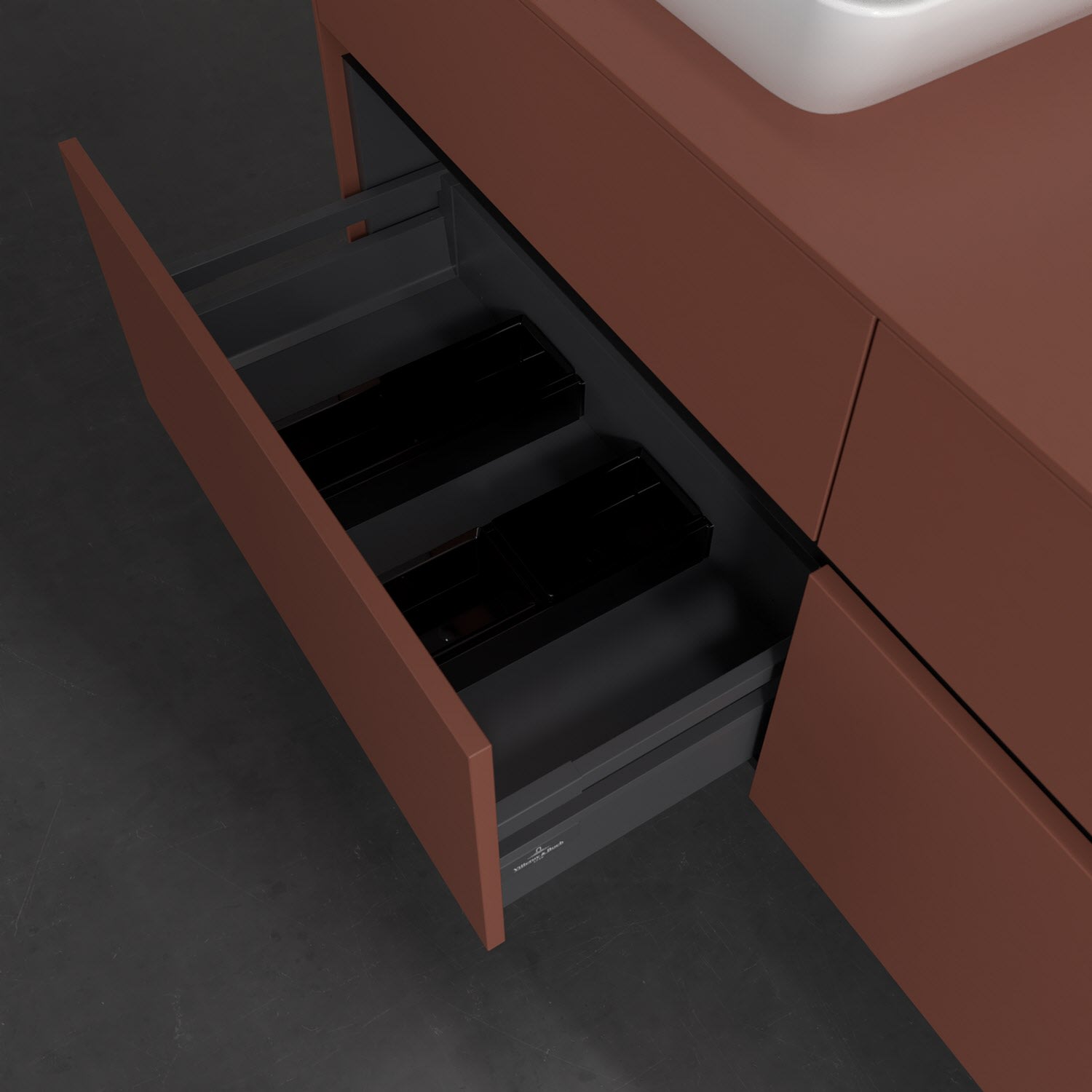 Stauraumwunder im zeitgemäßen Design: Der Villeroy & Boch Waschbeckenunterschrank aus der Collaro Kollektion eignet sich besonders für Familienbäder und bietet genau den Platz, der dort benötigt wird. Eine integrierte Griffleiste sorgt für eine schlichte, moderne Front. Steuern lässt sich das Licht über einen Touch-Sensor seitlich am Unterschrank. Im Inneren bietet das Möbelstück mit vier Auszügen erstaunlich viel Komfort – ermöglicht durch großzügiges Platzangebot und den integrierten Antirutschboden. Variabel setzbare Glasabtrennungen und mitgelieferte Accessory Boxen sorgen für den nötigen Überblick. Dank SoftClosing und Selbsteinzug lassen sich die Auszüge nach der Nutzung lautlos schließen. Die Front ist mit einer hochwertigen Lackierung versehen, deren Anti-Fingerprint-Oberfläche unschönen Fingerabdrücken vorbeugt.