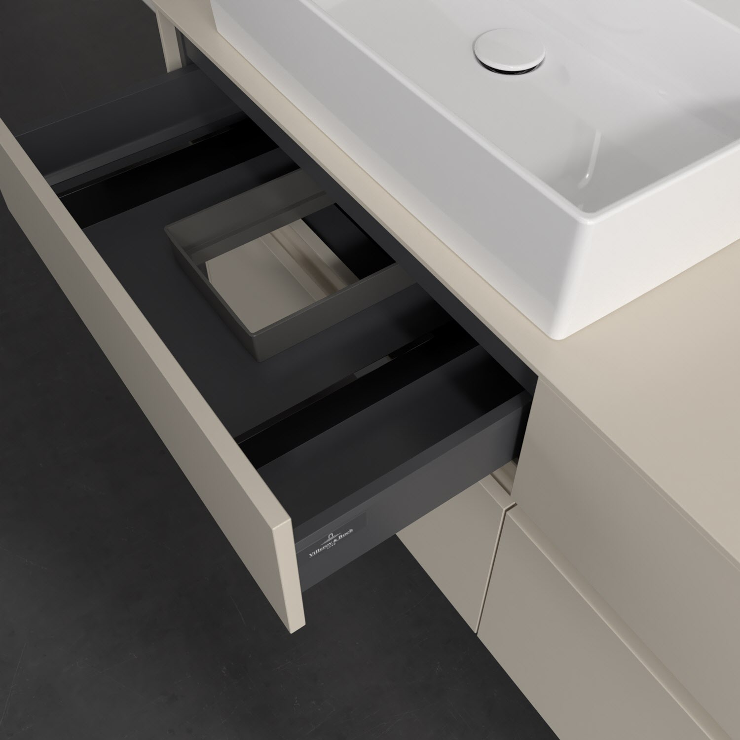 Stauraumwunder im zeitgemäßen Design: Der Villeroy & Boch Waschbeckenunterschrank aus der Collaro Kollektion eignet sich besonders für Familienbäder und bietet genau den Platz, der dort benötigt wird. Stimmungsvolles Highlight der schlichten, modernen Front ist die integrierte Griffmulde mit stufenlos einstellbarer LED-Beleuchtung. Im Inneren bietet das Möbelstück mit vier Auszügen erstaunlich viel Komfort – ermöglicht durch großzügiges Platzangebot und den integrierten Antirutschboden. Variabel setzbare Glasabtrennungen und mitgelieferte Accessory Boxen sorgen für den nötigen Überblick. Dank SoftClosing und Selbsteinzug lassen sich die Auszüge nach der Nutzung lautlos schließen. Die Front ist mit einer hochwertigen Lackierung versehen, deren Anti-Fingerprint-Oberfläche unschönen Fingerabdrücken vorbeugt.