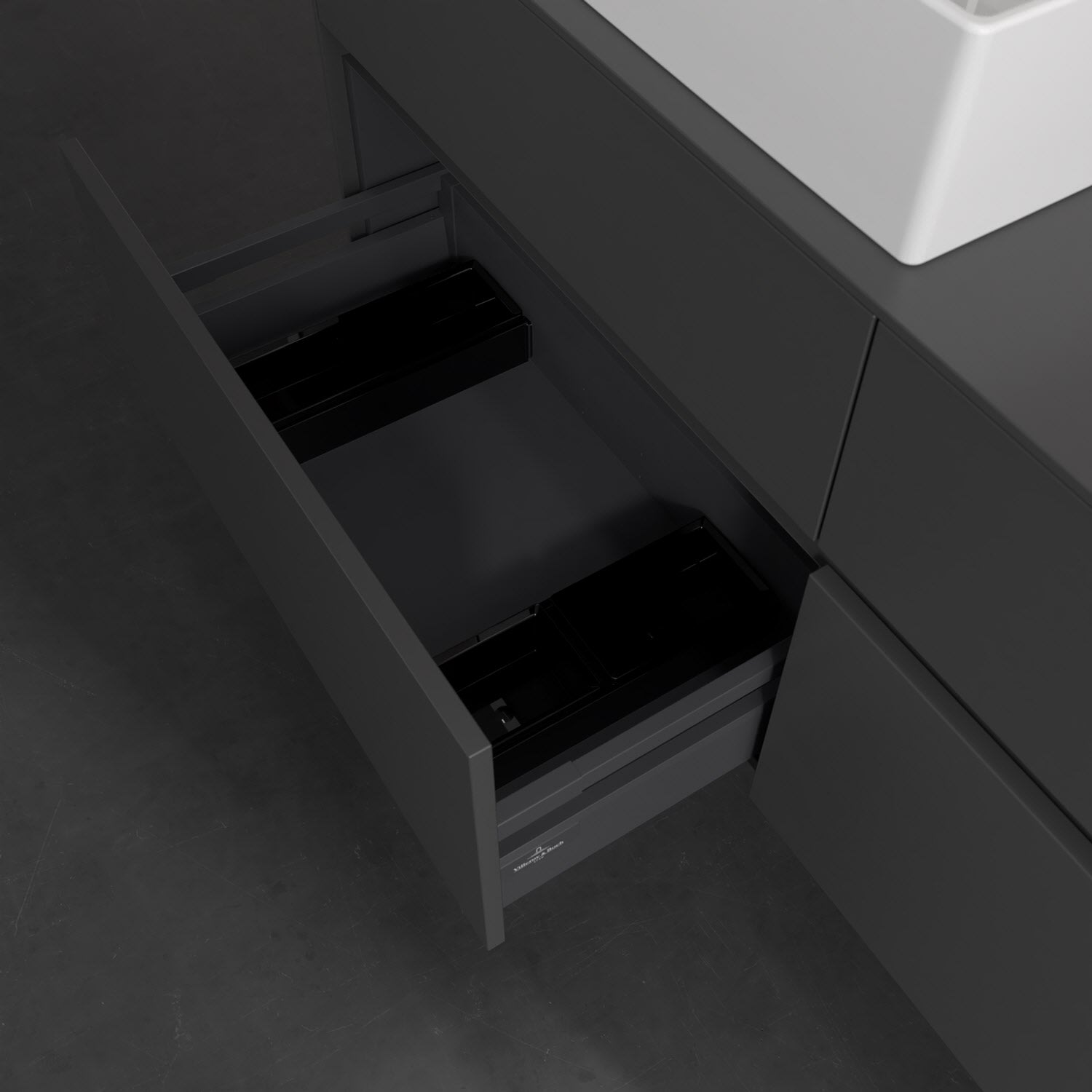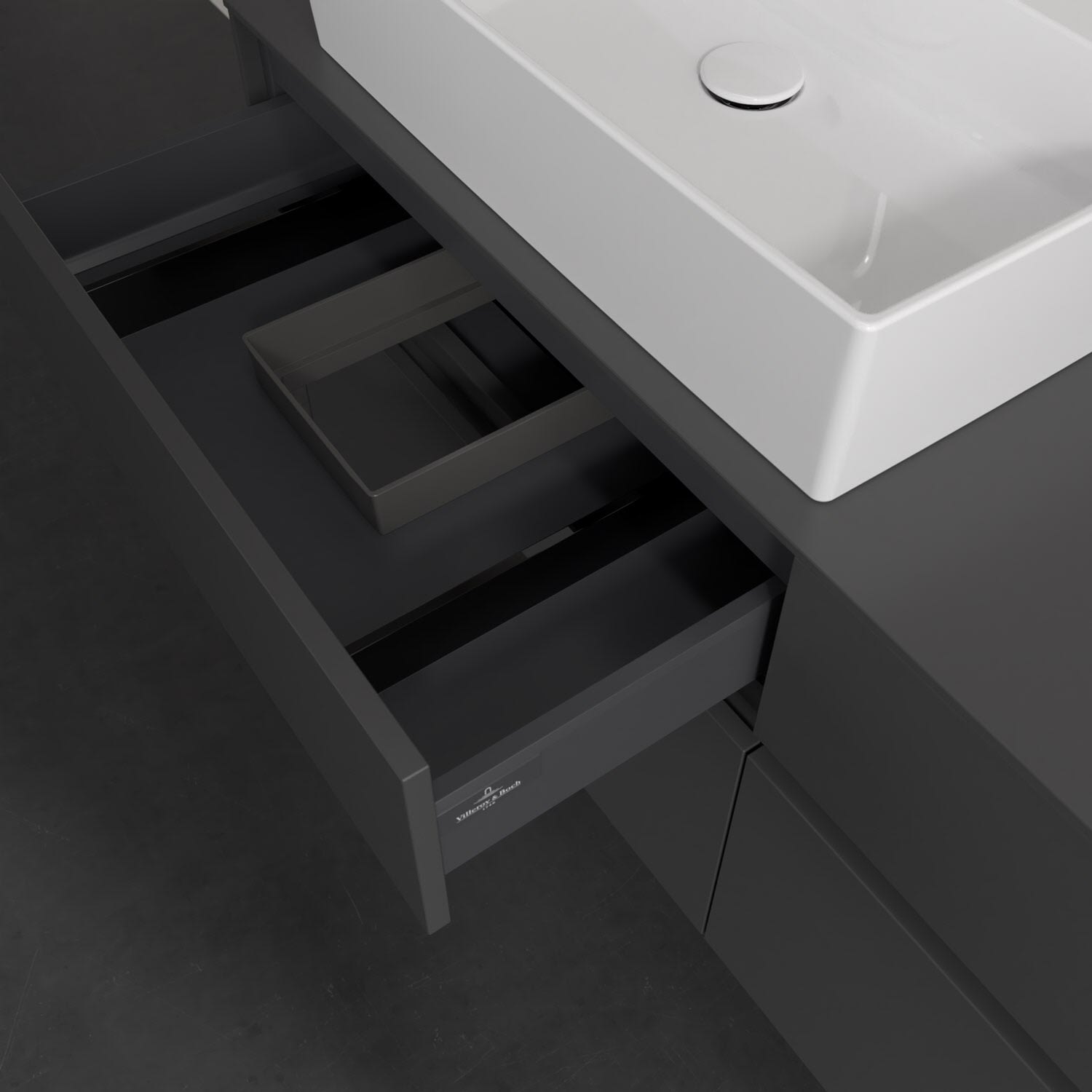 Stauraumwunder im zeitgemäßen Design: Der Villeroy & Boch Waschbeckenunterschrank aus der Collaro Kollektion eignet sich besonders für Familienbäder und bietet genau den Platz, der dort benötigt wird. Stimmungsvolles Highlight der schlichten, modernen Front ist die integrierte Griffmulde mit stufenlos einstellbarer LED-Beleuchtung. Im Inneren bietet das Möbelstück mit vier Auszügen erstaunlich viel Komfort – ermöglicht durch großzügiges Platzangebot und den integrierten Antirutschboden. Variabel setzbare Glasabtrennungen und mitgelieferte Accessory Boxen sorgen für den nötigen Überblick. Dank SoftClosing und Selbsteinzug lassen sich die Auszüge nach der Nutzung lautlos schließen. Die Front ist mit einer hochwertigen Lackierung versehen, deren Anti-Fingerprint-Oberfläche unschönen Fingerabdrücken vorbeugt.