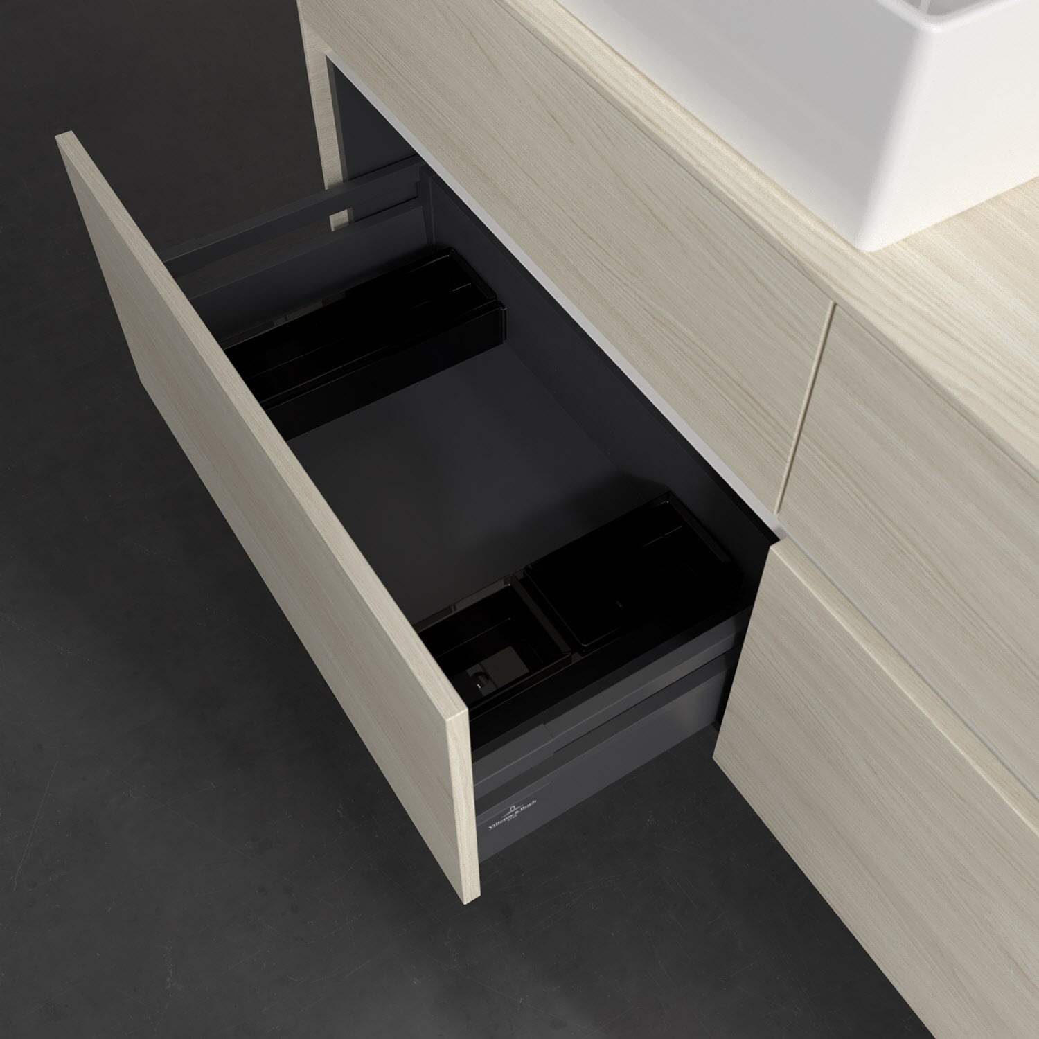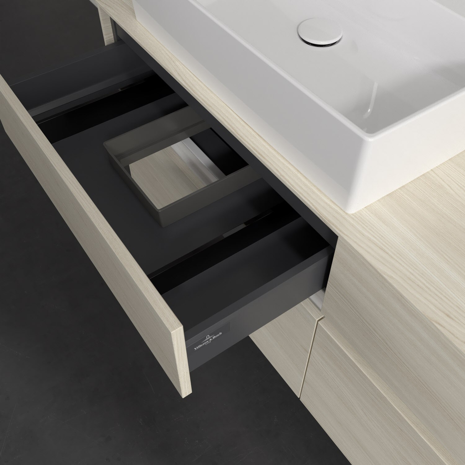 Stauraumwunder im zeitgemäßen Design: Der Villeroy & Boch Waschbeckenunterschrank aus der Collaro Kollektion eignet sich besonders für Familienbäder und bietet genau den Platz, der dort benötigt wird. Stimmungsvolles Highlight der schlichten, modernen Front ist die integrierte Griffmulde mit stufenlos einstellbarer LED-Beleuchtung. Im Inneren bietet das Möbelstück mit vier Auszügen erstaunlich viel Komfort – ermöglicht durch großzügiges Platzangebot und den integrierten Antirutschboden. Variabel setzbare Glasabtrennungen und mitgelieferte Accessory Boxen sorgen für den nötigen Überblick. Dank SoftClosing und Selbsteinzug lassen sich die Auszüge nach der Nutzung lautlos schließen. Für eine besonders leichte Reinigung sorgt die pflegeleichte Direktbeschichtung.