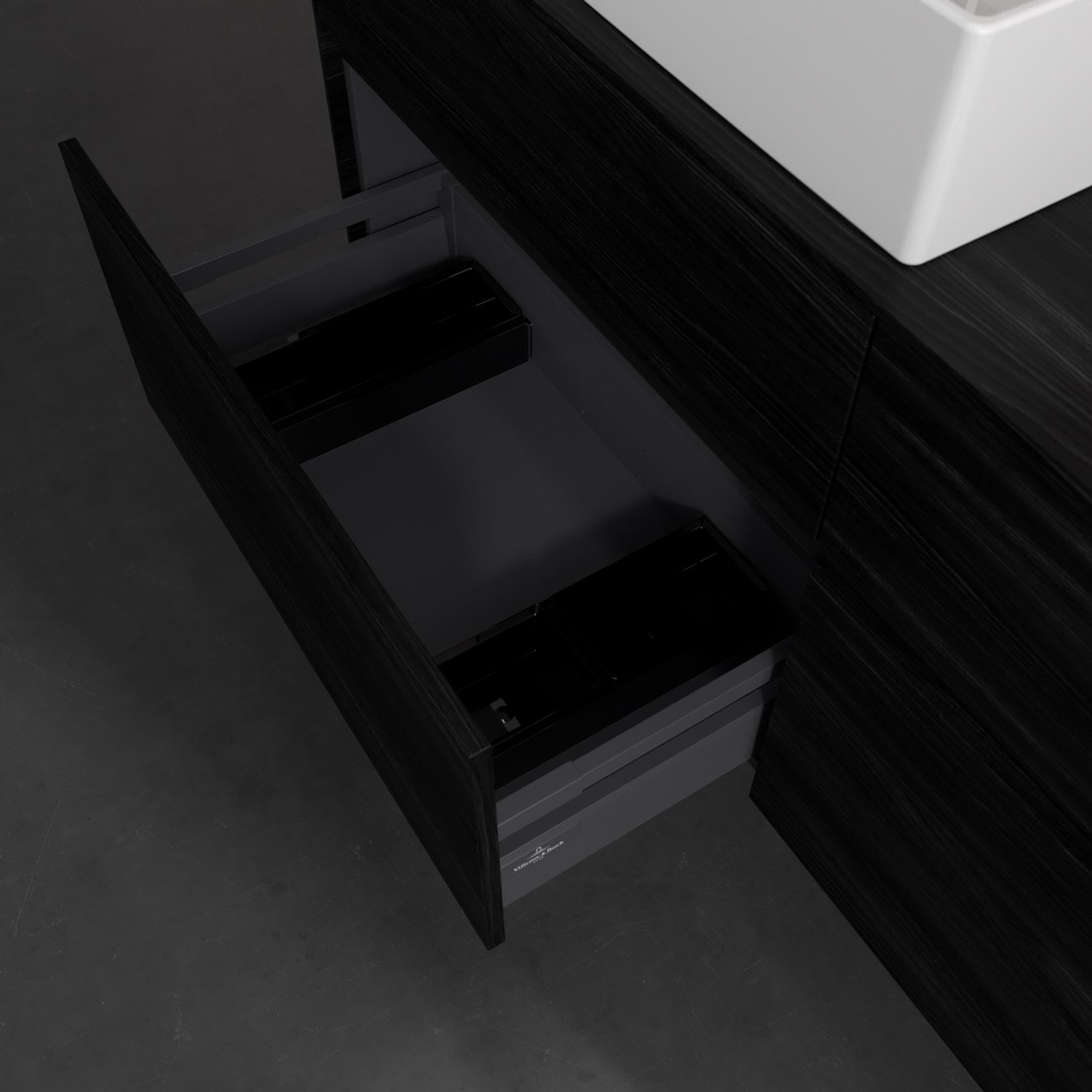 Stauraumwunder im zeitgemäßen Design: Der Villeroy & Boch Waschbeckenunterschrank aus der Collaro Kollektion eignet sich besonders für Familienbäder und bietet genau den Platz, der dort benötigt wird. Stimmungsvolles Highlight der schlichten, modernen Front ist die integrierte Griffmulde mit stufenlos einstellbarer LED-Beleuchtung. Im Inneren bietet das Möbelstück mit vier Auszügen erstaunlich viel Komfort – ermöglicht durch großzügiges Platzangebot und den integrierten Antirutschboden. Variabel setzbare Glasabtrennungen und mitgelieferte Accessory Boxen sorgen für den nötigen Überblick. Dank SoftClosing und Selbsteinzug lassen sich die Auszüge nach der Nutzung lautlos schließen. Die Front ist mit einer hochwertigen Lackierung versehen, deren Anti-Fingerprint-Oberfläche unschönen Fingerabdrücken vorbeugt.