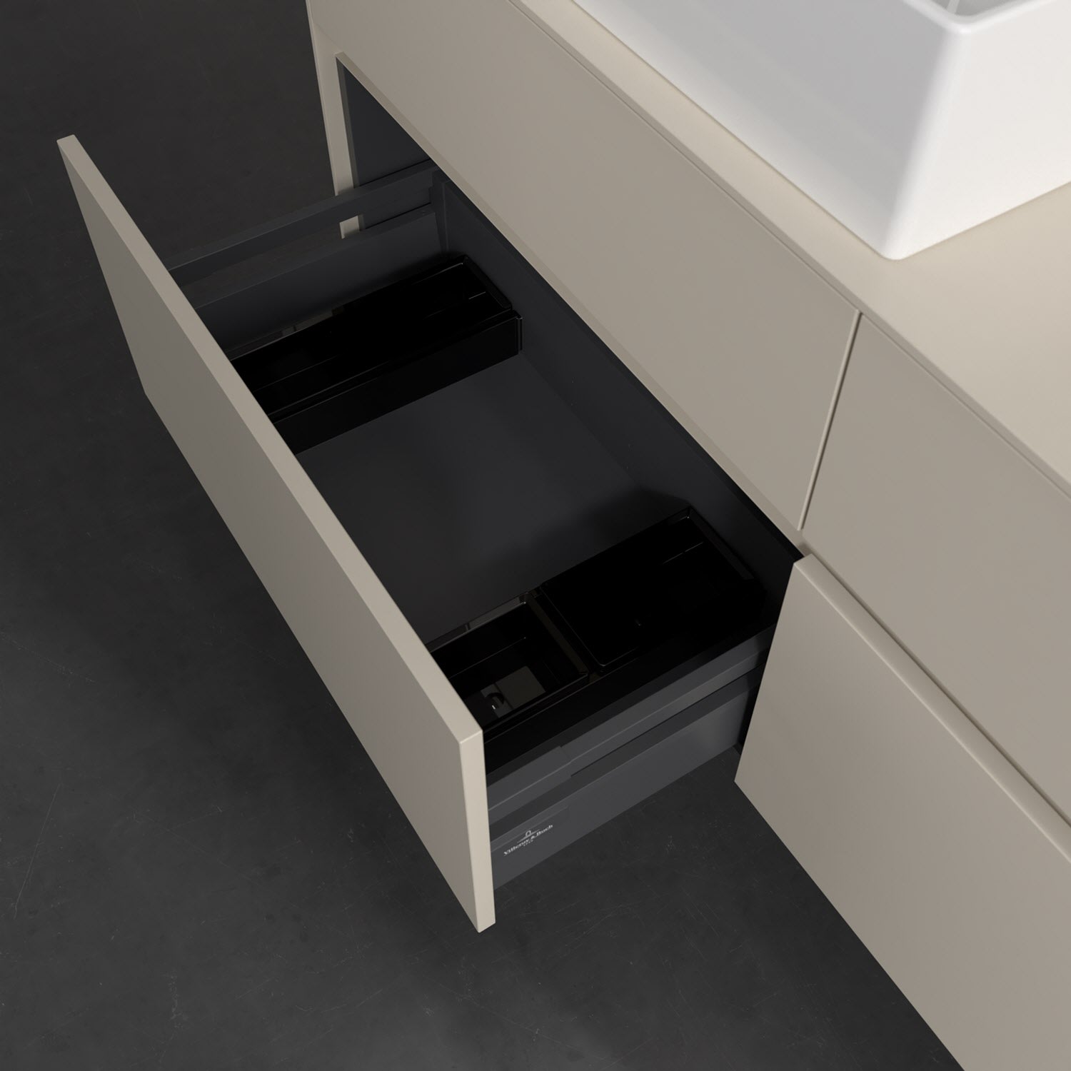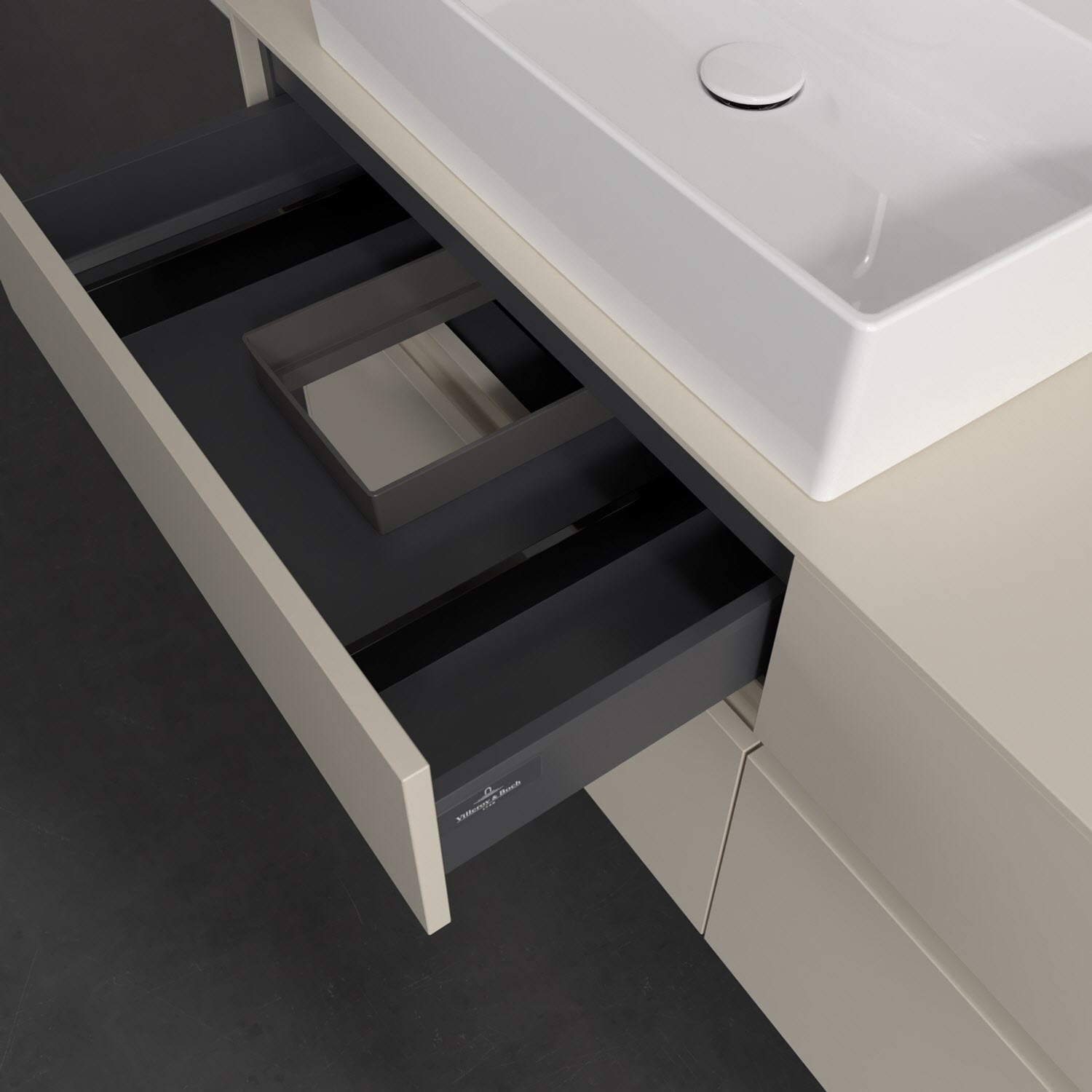 Stauraumwunder im zeitgemäßen Design: Der Villeroy & Boch Waschbeckenunterschrank aus der Collaro Kollektion eignet sich besonders für Familienbäder und bietet genau den Platz, der dort benötigt wird. Eine integrierte Griffleiste sorgt für eine schlichte, moderne Front. Steuern lässt sich das Licht über einen Touch-Sensor seitlich am Unterschrank. Im Inneren bietet das Möbelstück mit vier Auszügen erstaunlich viel Komfort – ermöglicht durch großzügiges Platzangebot und den integrierten Antirutschboden. Variabel setzbare Glasabtrennungen und mitgelieferte Accessory Boxen sorgen für den nötigen Überblick. Dank SoftClosing und Selbsteinzug lassen sich die Auszüge nach der Nutzung lautlos schließen. Die Front ist mit einer hochwertigen Lackierung versehen, deren Anti-Fingerprint-Oberfläche unschönen Fingerabdrücken vorbeugt.