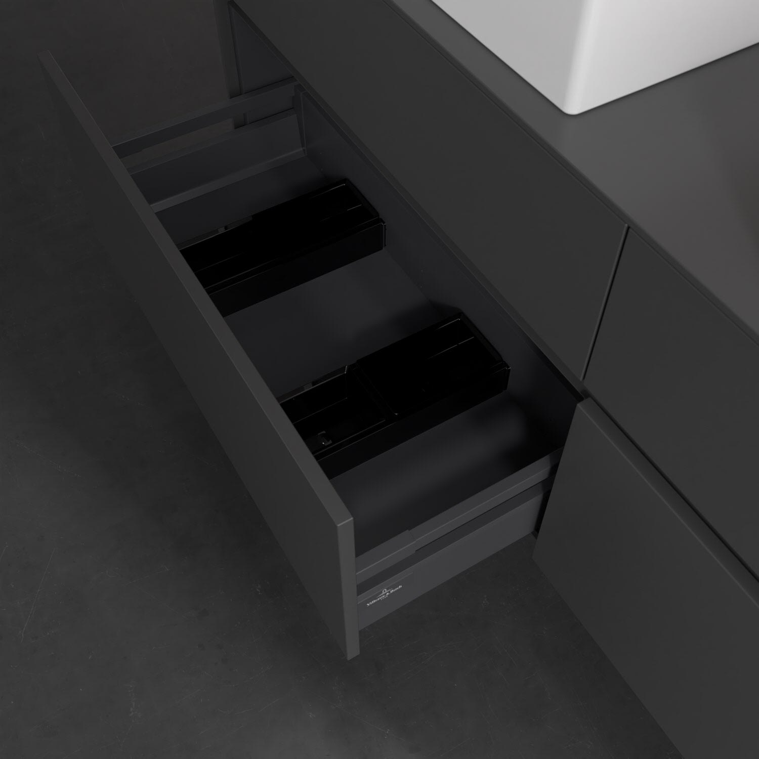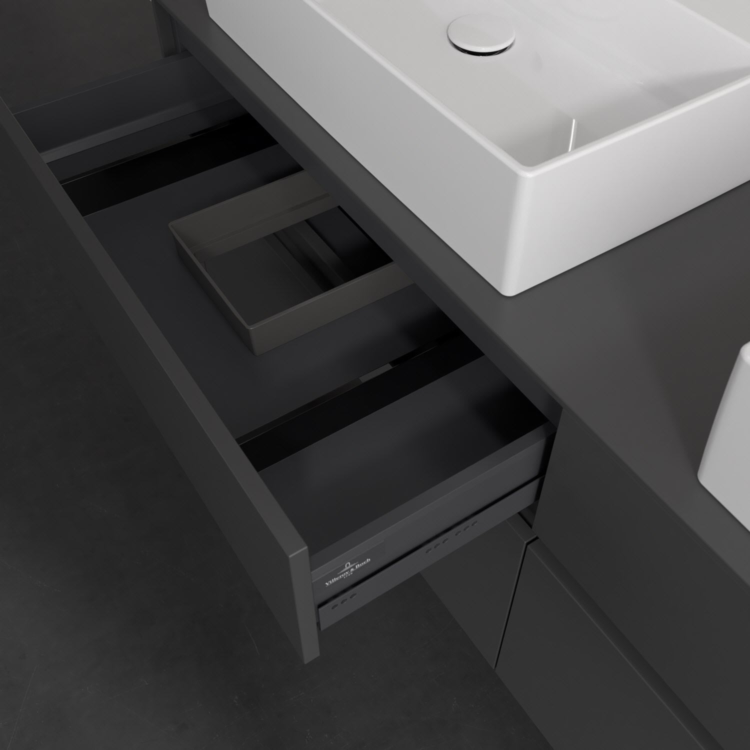 Stauraumwunder im zeitgemäßen Design: Der Villeroy & Boch Waschbeckenunterschrank aus der Collaro Kollektion eignet sich besonders für Familienbäder und bietet genau den Platz, der dort benötigt wird. Stimmungsvolles Highlight der schlichten, modernen Front ist die integrierte Griffmulde mit stufenlos einstellbarer LED-Beleuchtung. Im Inneren bietet das Möbelstück mit vier Auszügen erstaunlich viel Komfort – ermöglicht durch großzügiges Platzangebot und den integrierten Antirutschboden. Variabel setzbare Glasabtrennungen und mitgelieferte Accessory Boxen sorgen für den nötigen Überblick. Dank SoftClosing und Selbsteinzug lassen sich die Auszüge nach der Nutzung lautlos schließen. Die Front ist mit einer hochwertigen Lackierung versehen, deren Anti-Fingerprint-Oberfläche unschönen Fingerabdrücken vorbeugt.