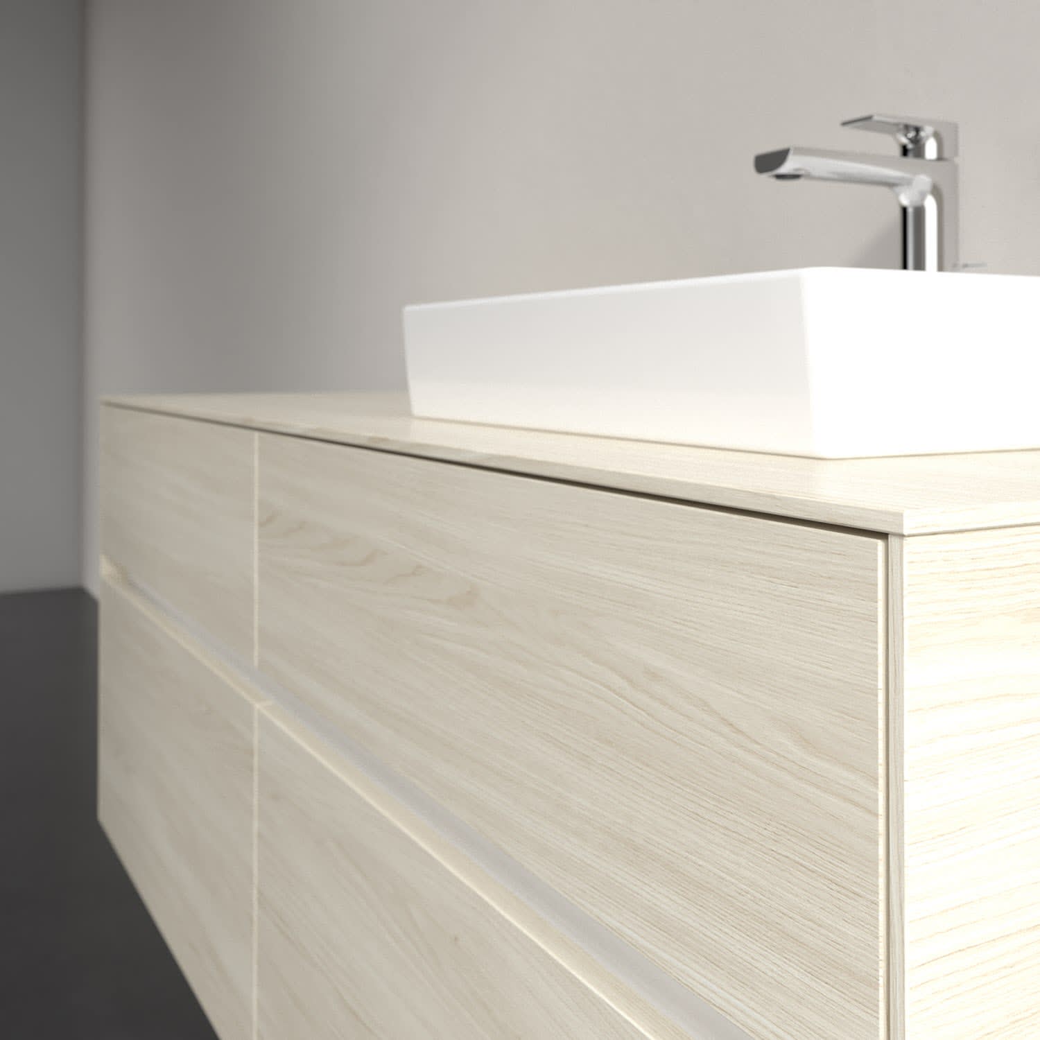 Stauraumwunder im zeitgemäßen Design: Der Villeroy & Boch Waschbeckenunterschrank aus der Collaro Kollektion eignet sich besonders für Familienbäder und bietet genau den Platz, der dort benötigt wird. Stimmungsvolles Highlight der schlichten, modernen Front ist die integrierte Griffmulde mit stufenlos einstellbarer LED-Beleuchtung. Im Inneren bietet das Möbelstück mit vier Auszügen erstaunlich viel Komfort – ermöglicht durch großzügiges Platzangebot und den integrierten Antirutschboden. Variabel setzbare Glasabtrennungen und mitgelieferte Accessory Boxen sorgen für den nötigen Überblick. Dank SoftClosing und Selbsteinzug lassen sich die Auszüge nach der Nutzung lautlos schließen. Für eine besonders leichte Reinigung sorgt die pflegeleichte Direktbeschichtung.