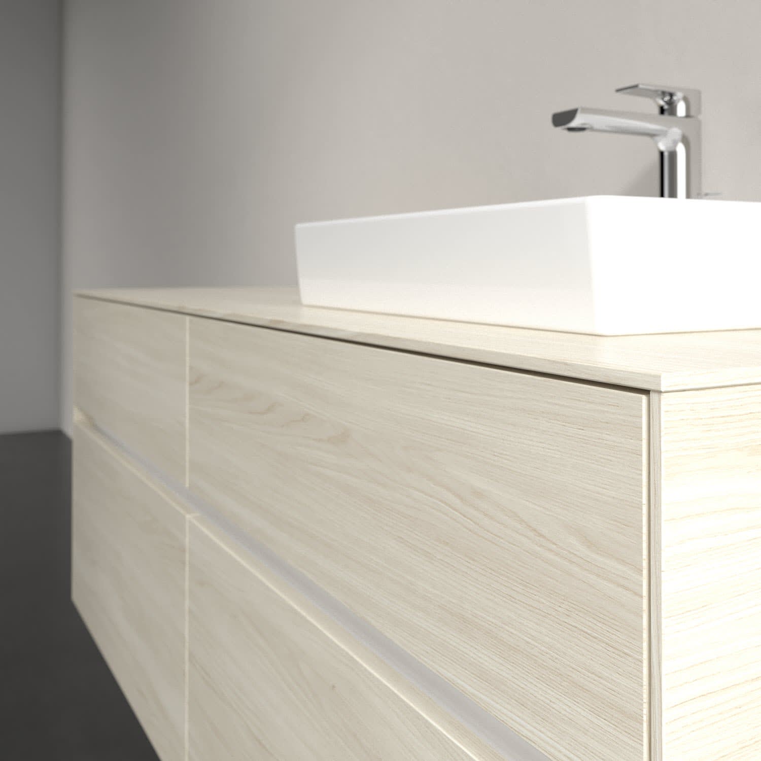 Stauraumwunder im zeitgemäßen Design: Der Villeroy & Boch Waschbeckenunterschrank aus der Collaro Kollektion eignet sich besonders für Familienbäder und bietet genau den Platz, der dort benötigt wird. Eine integrierte Griffleiste sorgt für eine schlichte, moderne Front. Steuern lässt sich das Licht über einen Touch-Sensor seitlich am Unterschrank. Im Inneren bietet das Möbelstück mit vier Auszügen erstaunlich viel Komfort – ermöglicht durch großzügiges Platzangebot und den integrierten Antirutschboden. Variabel setzbare Glasabtrennungen und mitgelieferte Accessory Boxen sorgen für den nötigen Überblick. Dank SoftClosing und Selbsteinzug lassen sich die Auszüge nach der Nutzung lautlos schließen. Für eine besonders leichte Reinigung sorgt die pflegeleichte Direktbeschichtung.