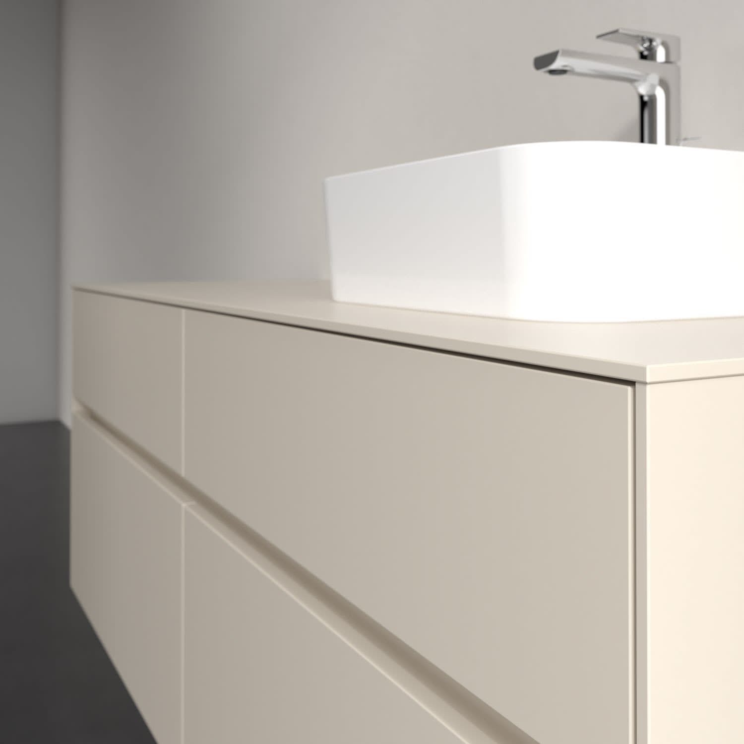 Stauraumwunder im zeitgemäßen Design: Der Villeroy & Boch Waschbeckenunterschrank aus der Collaro Kollektion eignet sich besonders für Familienbäder und bietet genau den Platz, der dort benötigt wird. Stimmungsvolles Highlight der schlichten, modernen Front ist die integrierte Griffmulde mit stufenlos einstellbarer LED-Beleuchtung. Im Inneren bietet das Möbelstück mit vier Auszügen erstaunlich viel Komfort – ermöglicht durch großzügiges Platzangebot und den integrierten Antirutschboden. Variabel setzbare Glasabtrennungen und mitgelieferte Accessory Boxen sorgen für den nötigen Überblick. Dank SoftClosing und Selbsteinzug lassen sich die Auszüge nach der Nutzung lautlos schließen. Die Front ist mit einer hochwertigen Lackierung versehen, deren Anti-Fingerprint-Oberfläche unschönen Fingerabdrücken vorbeugt.