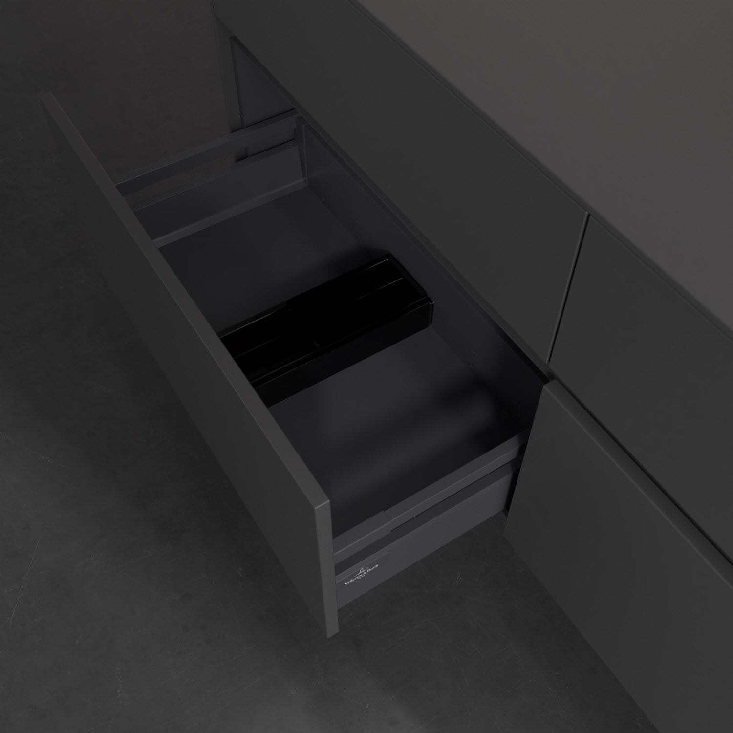 Stauraumwunder im zeitgemäßen Design: Der Villeroy & Boch Waschbeckenunterschrank aus der Collaro Kollektion eignet sich besonders für Familienbäder und bietet genau den Platz, der dort benötigt wird. Stimmungsvolles Highlight der schlichten, modernen Front ist die integrierte Griffmulde mit stufenlos einstellbarer LED-Beleuchtung. Im Inneren bietet das Möbelstück mit vier Auszügen erstaunlich viel Komfort – ermöglicht durch großzügiges Platzangebot und den integrierten Antirutschboden. Variabel setzbare Glasabtrennungen und mitgelieferte Accessory Boxen sorgen für den nötigen Überblick. Dank SoftClosing und Selbsteinzug lassen sich die Auszüge nach der Nutzung lautlos schließen. Die Front ist mit einer hochwertigen Lackierung versehen, deren Anti-Fingerprint-Oberfläche unschönen Fingerabdrücken vorbeugt.