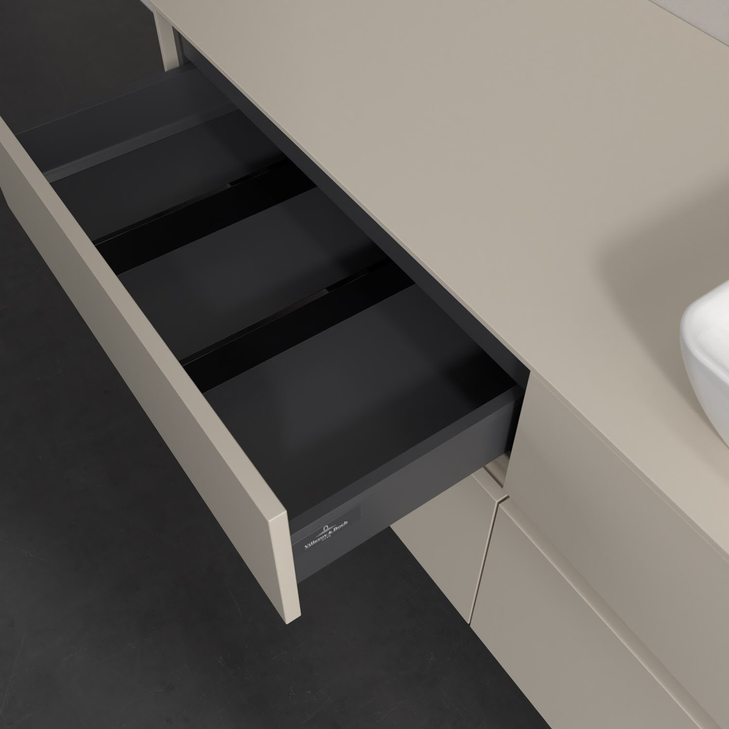 Stauraumwunder im zeitgemäßen Design: Der Villeroy & Boch Waschbeckenunterschrank aus der Collaro Kollektion eignet sich besonders für Familienbäder und bietet genau den Platz, der dort benötigt wird. Eine integrierte Griffleiste sorgt für eine schlichte, moderne Front. Steuern lässt sich das Licht über einen Touch-Sensor seitlich am Unterschrank. Im Inneren bietet das Möbelstück mit vier Auszügen erstaunlich viel Komfort – ermöglicht durch großzügiges Platzangebot und den integrierten Antirutschboden. Variabel setzbare Glasabtrennungen und mitgelieferte Accessory Boxen sorgen für den nötigen Überblick. Dank SoftClosing und Selbsteinzug lassen sich die Auszüge nach der Nutzung lautlos schließen. Die Front ist mit einer hochwertigen Lackierung versehen, deren Anti-Fingerprint-Oberfläche unschönen Fingerabdrücken vorbeugt.