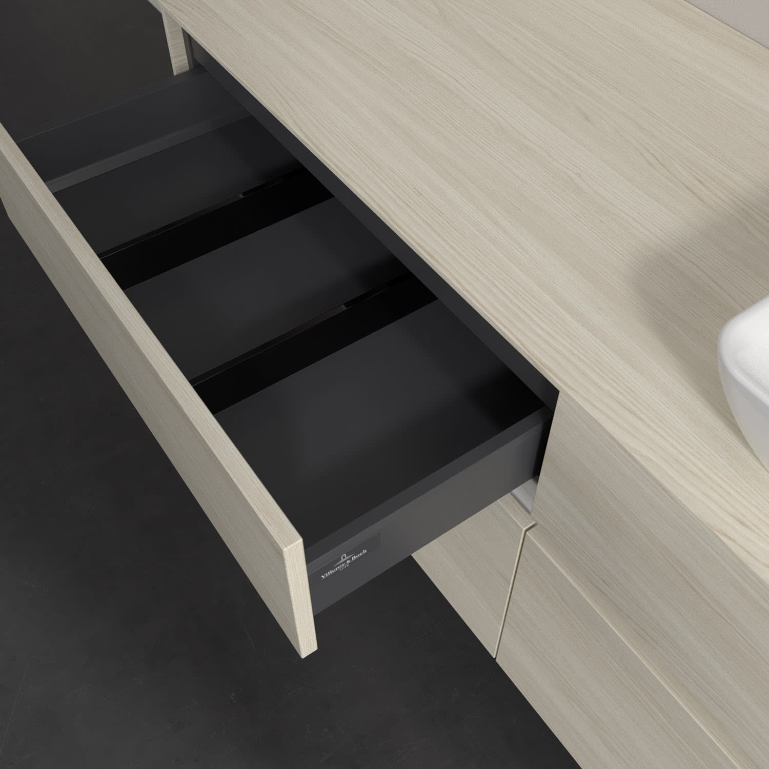 Stauraumwunder im zeitgemäßen Design: Der Villeroy & Boch Waschbeckenunterschrank aus der Collaro Kollektion eignet sich besonders für Familienbäder und bietet genau den Platz, der dort benötigt wird. Eine integrierte Griffleiste sorgt für eine schlichte, moderne Front. Steuern lässt sich das Licht über einen Touch-Sensor seitlich am Unterschrank. Im Inneren bietet das Möbelstück mit vier Auszügen erstaunlich viel Komfort – ermöglicht durch großzügiges Platzangebot und den integrierten Antirutschboden. Variabel setzbare Glasabtrennungen und mitgelieferte Accessory Boxen sorgen für den nötigen Überblick. Dank SoftClosing und Selbsteinzug lassen sich die Auszüge nach der Nutzung lautlos schließen. Für eine besonders leichte Reinigung sorgt die pflegeleichte Direktbeschichtung.