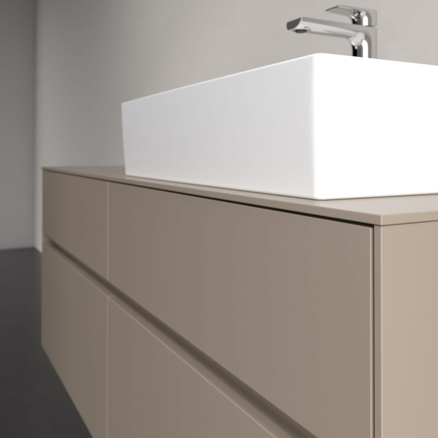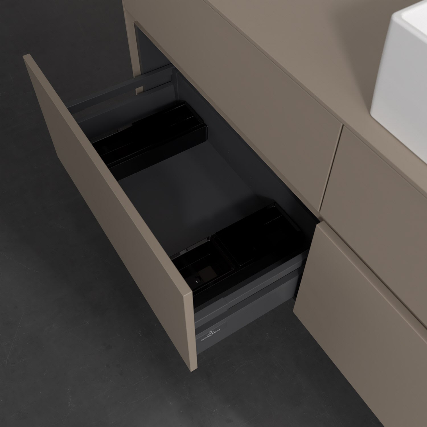 Stauraumwunder im zeitgemäßen Design: Der Villeroy & Boch Waschbeckenunterschrank aus der Collaro Kollektion eignet sich besonders für Familienbäder und bietet genau den Platz, der dort benötigt wird. Stimmungsvolles Highlight der schlichten, modernen Front ist die integrierte Griffmulde mit stufenlos einstellbarer LED-Beleuchtung. Im Inneren bietet das Möbelstück mit vier Auszügen erstaunlich viel Komfort – ermöglicht durch großzügiges Platzangebot und den integrierten Antirutschboden. Variabel setzbare Glasabtrennungen und mitgelieferte Accessory Boxen sorgen für den nötigen Überblick. Dank SoftClosing und Selbsteinzug lassen sich die Auszüge nach der Nutzung lautlos schließen. Die Front ist mit einer hochwertigen Lackierung versehen, deren Anti-Fingerprint-Oberfläche unschönen Fingerabdrücken vorbeugt.
