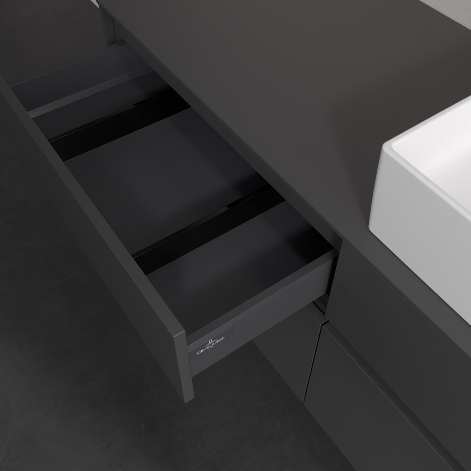 Stauraumwunder im zeitgemäßen Design: Der Villeroy & Boch Waschbeckenunterschrank aus der Collaro Kollektion eignet sich besonders für Familienbäder und bietet genau den Platz, der dort benötigt wird. Stimmungsvolles Highlight der schlichten, modernen Front ist die integrierte Griffmulde mit stufenlos einstellbarer LED-Beleuchtung. Im Inneren bietet das Möbelstück mit vier Auszügen erstaunlich viel Komfort – ermöglicht durch großzügiges Platzangebot und den integrierten Antirutschboden. Variabel setzbare Glasabtrennungen und mitgelieferte Accessory Boxen sorgen für den nötigen Überblick. Dank SoftClosing und Selbsteinzug lassen sich die Auszüge nach der Nutzung lautlos schließen. Die Front ist mit einer hochwertigen Lackierung versehen, deren Anti-Fingerprint-Oberfläche unschönen Fingerabdrücken vorbeugt.