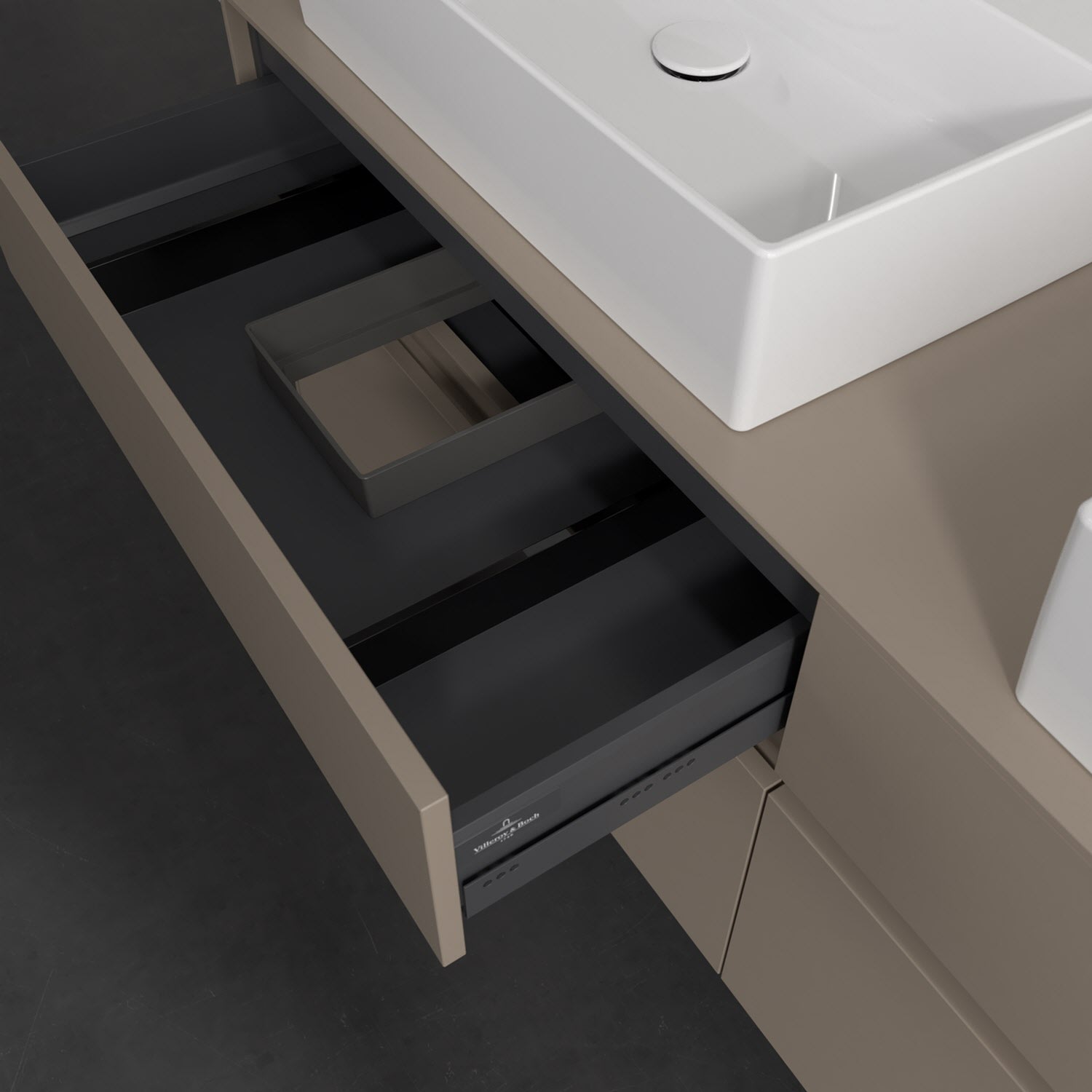 Stauraumwunder im zeitgemäßen Design: Der Villeroy & Boch Waschbeckenunterschrank aus der Collaro Kollektion eignet sich besonders für Familienbäder und bietet genau den Platz, der dort benötigt wird. Eine integrierte Griffleiste sorgt für eine schlichte, moderne Front. Steuern lässt sich das Licht über einen Touch-Sensor seitlich am Unterschrank. Im Inneren bietet das Möbelstück mit vier Auszügen erstaunlich viel Komfort – ermöglicht durch großzügiges Platzangebot und den integrierten Antirutschboden. Variabel setzbare Glasabtrennungen und mitgelieferte Accessory Boxen sorgen für den nötigen Überblick. Dank SoftClosing und Selbsteinzug lassen sich die Auszüge nach der Nutzung lautlos schließen. Die Front ist mit einer hochwertigen Lackierung versehen, deren Anti-Fingerprint-Oberfläche unschönen Fingerabdrücken vorbeugt.