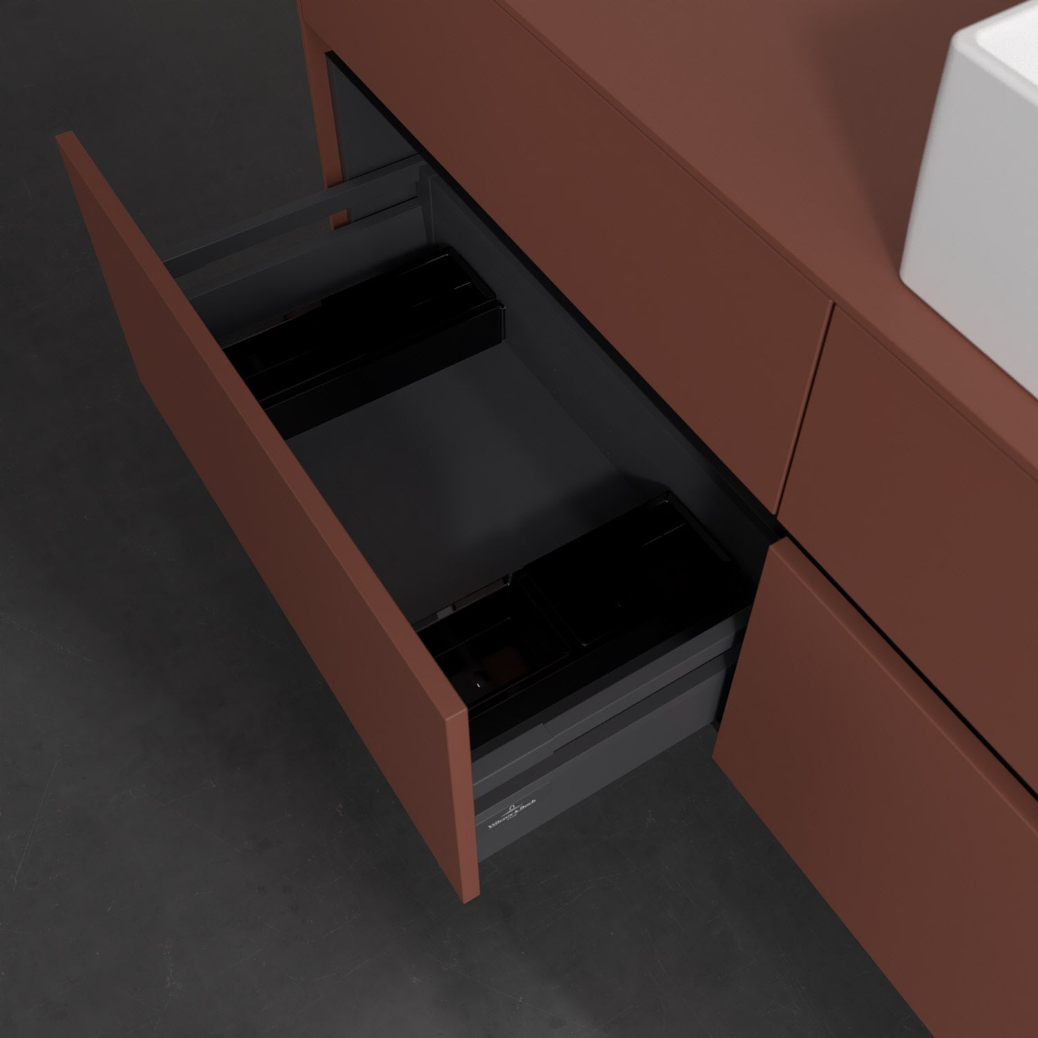 Stauraumwunder im zeitgemäßen Design: Der Villeroy & Boch Waschbeckenunterschrank aus der Collaro Kollektion eignet sich besonders für Familienbäder und bietet genau den Platz, der dort benötigt wird. Eine integrierte Griffleiste sorgt für eine schlichte, moderne Front. Steuern lässt sich das Licht über einen Touch-Sensor seitlich am Unterschrank. Im Inneren bietet das Möbelstück mit vier Auszügen erstaunlich viel Komfort – ermöglicht durch großzügiges Platzangebot und den integrierten Antirutschboden. Variabel setzbare Glasabtrennungen und mitgelieferte Accessory Boxen sorgen für den nötigen Überblick. Dank SoftClosing und Selbsteinzug lassen sich die Auszüge nach der Nutzung lautlos schließen. Die Front ist mit einer hochwertigen Lackierung versehen, deren Anti-Fingerprint-Oberfläche unschönen Fingerabdrücken vorbeugt.