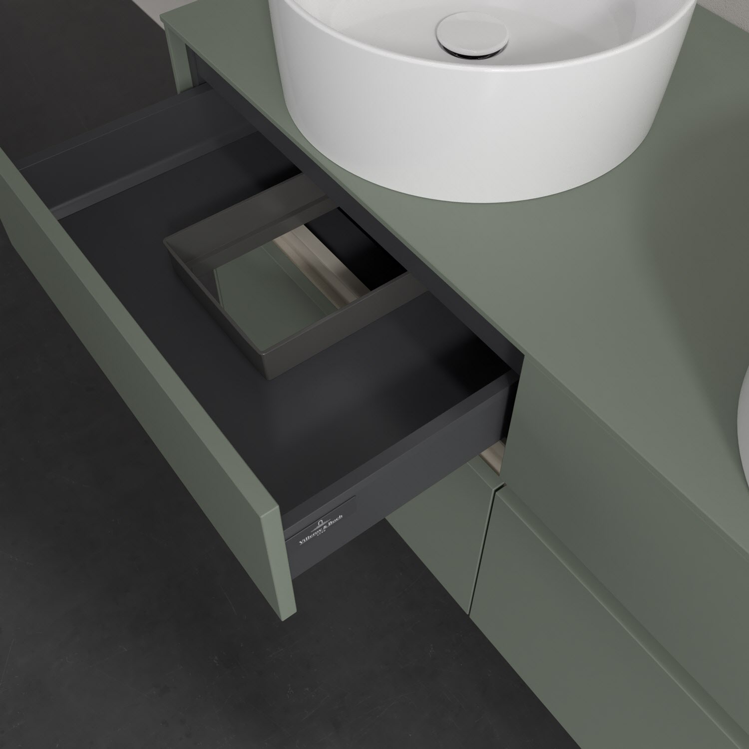 Stauraumwunder im zeitgemäßen Design: Der Villeroy & Boch Waschbeckenunterschrank aus der Collaro Kollektion eignet sich besonders für Familienbäder und bietet genau den Platz, der dort benötigt wird. Eine integrierte Griffleiste sorgt für eine schlichte, moderne Front. Im Inneren bietet das Möbelstück mit vier Auszügen erstaunlich viel Komfort – ermöglicht durch großzügiges Platzangebot und den integrierten Antirutschboden. Variabel setzbare Glasabtrennungen und mitgelieferte Accessory Boxen sorgen für den nötigen Überblick. Dank SoftClosing und Selbsteinzug lassen sich die Auszüge nach der Nutzung lautlos schließen. Die Front ist mit einer hochwertigen Lackierung versehen, deren Anti-Fingerprint-Oberfläche unschönen Fingerabdrücken vorbeugt.