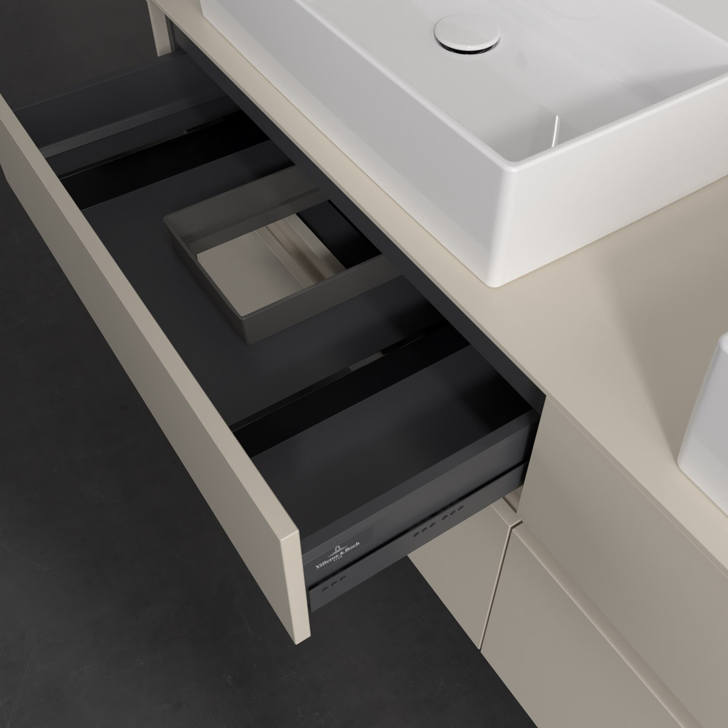Stauraumwunder im zeitgemäßen Design: Der Villeroy & Boch Waschbeckenunterschrank aus der Collaro Kollektion eignet sich besonders für Familienbäder und bietet genau den Platz, der dort benötigt wird. Eine integrierte Griffleiste sorgt für eine schlichte, moderne Front. Steuern lässt sich das Licht über einen Touch-Sensor seitlich am Unterschrank. Im Inneren bietet das Möbelstück mit vier Auszügen erstaunlich viel Komfort – ermöglicht durch großzügiges Platzangebot und den integrierten Antirutschboden. Variabel setzbare Glasabtrennungen und mitgelieferte Accessory Boxen sorgen für den nötigen Überblick. Dank SoftClosing und Selbsteinzug lassen sich die Auszüge nach der Nutzung lautlos schließen. Die Front ist mit einer hochwertigen Lackierung versehen, deren Anti-Fingerprint-Oberfläche unschönen Fingerabdrücken vorbeugt.