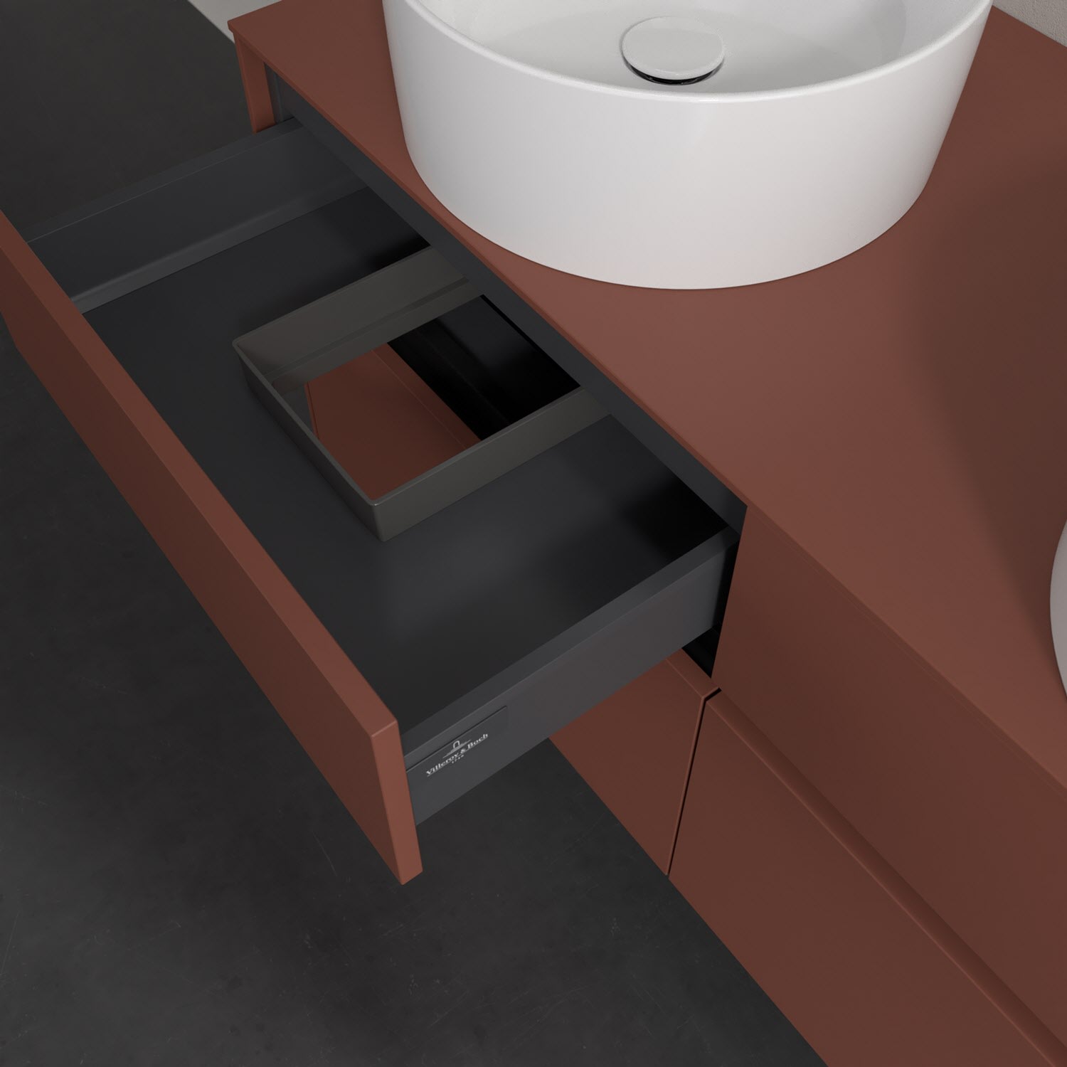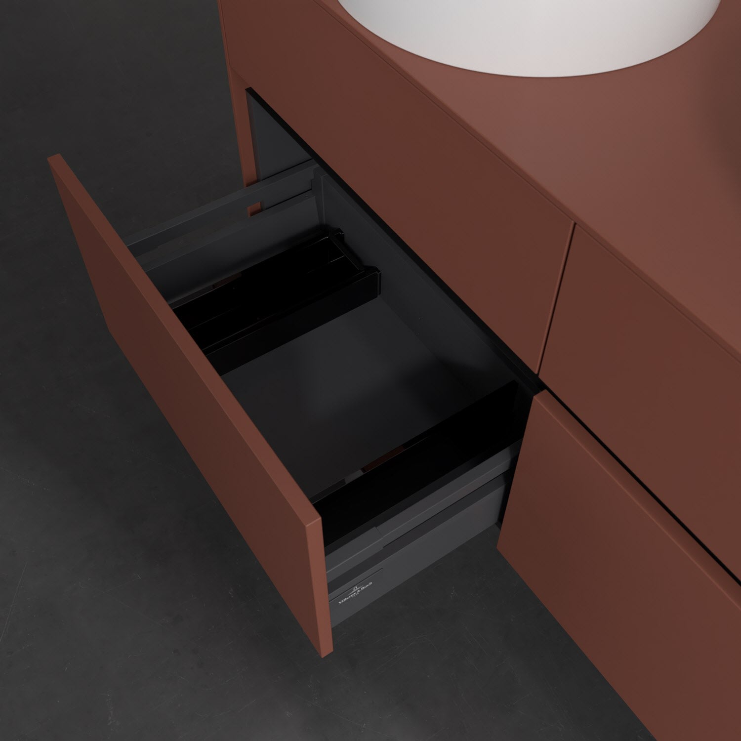 Stauraumwunder im zeitgemäßen Design: Der Villeroy & Boch Waschbeckenunterschrank aus der Collaro Kollektion eignet sich besonders für Familienbäder und bietet genau den Platz, der dort benötigt wird. Eine integrierte Griffleiste sorgt für eine schlichte, moderne Front. Im Inneren bietet das Möbelstück mit vier Auszügen erstaunlich viel Komfort – ermöglicht durch großzügiges Platzangebot und den integrierten Antirutschboden. Variabel setzbare Glasabtrennungen und mitgelieferte Accessory Boxen sorgen für den nötigen Überblick. Dank SoftClosing und Selbsteinzug lassen sich die Auszüge nach der Nutzung lautlos schließen. Die Front ist mit einer hochwertigen Lackierung versehen, deren Anti-Fingerprint-Oberfläche unschönen Fingerabdrücken vorbeugt.