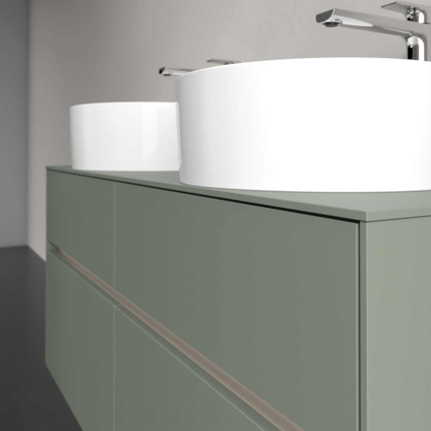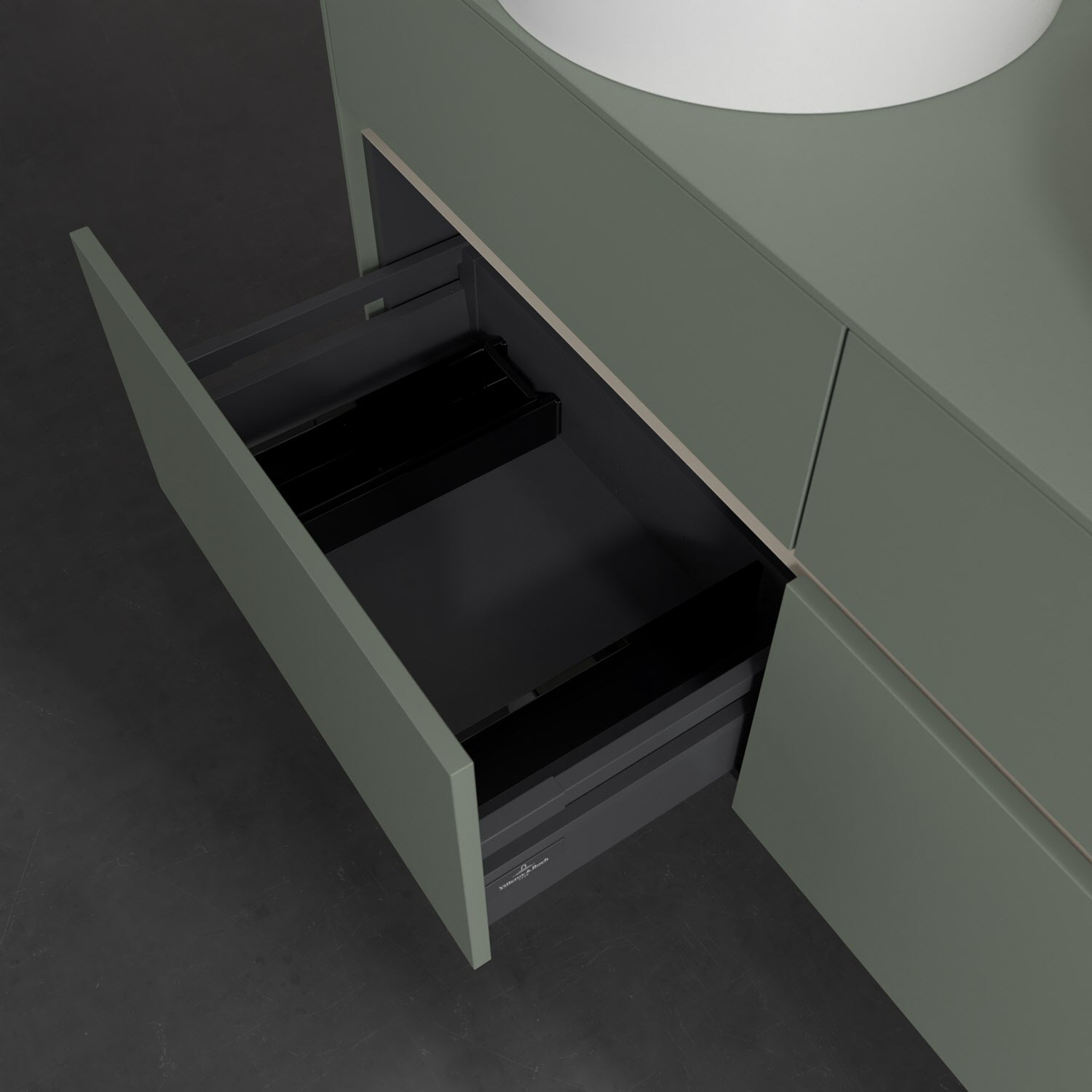 Stauraumwunder im zeitgemäßen Design: Der Villeroy & Boch Waschbeckenunterschrank aus der Collaro Kollektion eignet sich besonders für Familienbäder und bietet genau den Platz, der dort benötigt wird. Stimmungsvolles Highlight der schlichten, modernen Front ist die integrierte Griffmulde mit stufenlos einstellbarer LED-Beleuchtung. Steuern lässt sie sich über einen Touch-Sensor seitlich am Unterschrank. Im Inneren bietet das Möbelstück mit vier Auszügen erstaunlich viel Komfort – ermöglicht durch großzügiges Platzangebot und den integrierten Antirutschboden. Variabel setzbare Glasabtrennungen und mitgelieferte Accessory Boxen sorgen für den nötigen Überblick. Dank SoftClosing und Selbsteinzug lassen sich die Auszüge nach der Nutzung lautlos schließen. Die Front ist mit einer hochwertigen Lackierung versehen, deren Anti-Fingerprint-Oberfläche unschönen Fingerabdrücken vorbeugt.