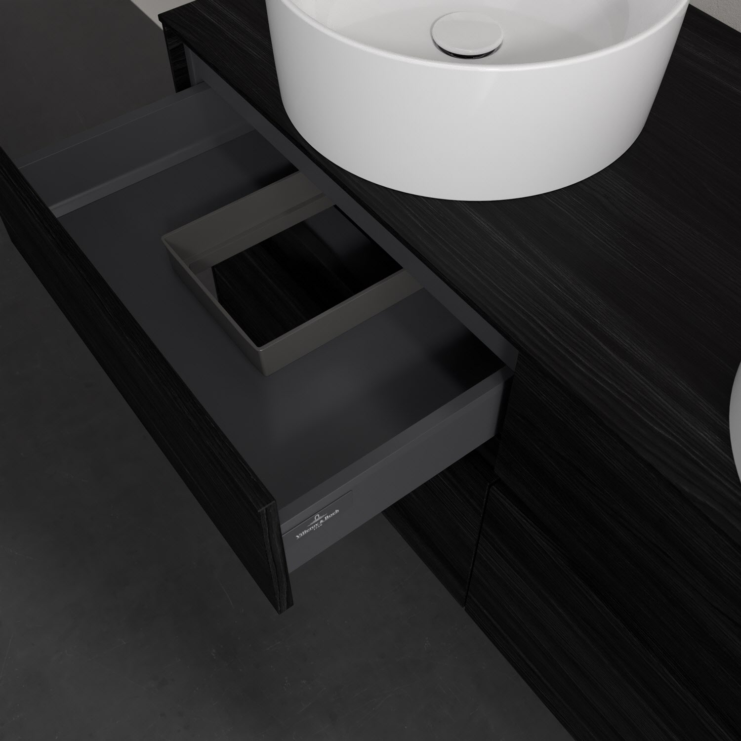 Stauraumwunder im zeitgemäßen Design: Der Villeroy & Boch Waschbeckenunterschrank aus der Collaro Kollektion eignet sich besonders für Familienbäder und bietet genau den Platz, der dort benötigt wird. Stimmungsvolles Highlight der schlichten, modernen Front ist die integrierte Griffmulde mit stufenlos einstellbarer LED-Beleuchtung. Steuern lässt sie sich über einen Touch-Sensor seitlich am Unterschrank. Im Inneren bietet das Möbelstück mit vier Auszügen erstaunlich viel Komfort – ermöglicht durch großzügiges Platzangebot und den integrierten Antirutschboden. Variabel setzbare Glasabtrennungen und mitgelieferte Accessory Boxen sorgen für den nötigen Überblick. Dank SoftClosing und Selbsteinzug lassen sich die Auszüge nach der Nutzung lautlos schließen. Die Front ist mit einer hochwertigen Lackierung versehen, deren Anti-Fingerprint-Oberfläche unschönen Fingerabdrücken vorbeugt.
