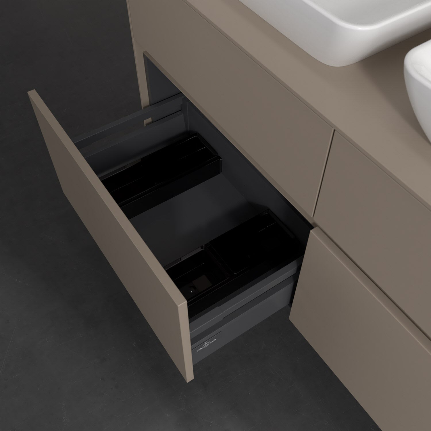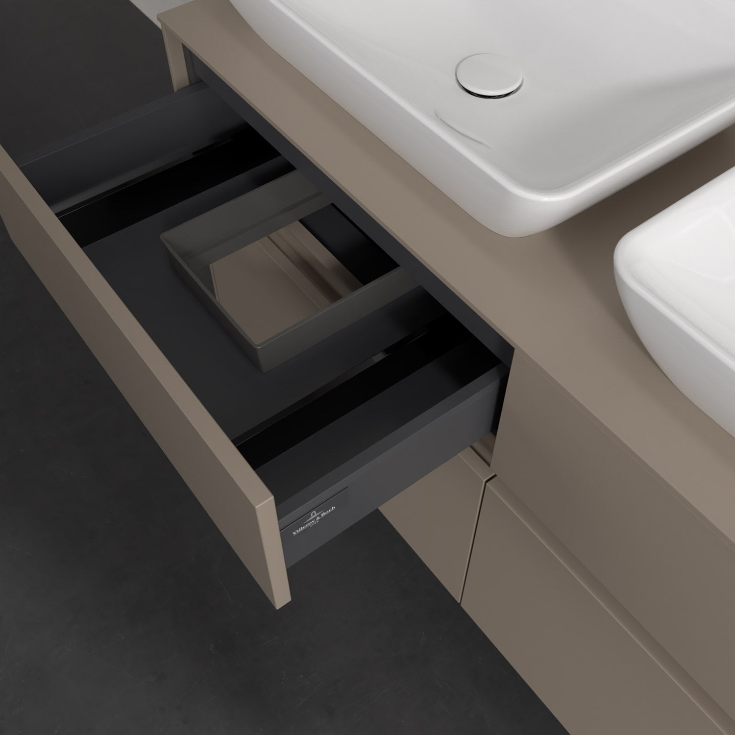 Stauraumwunder im zeitgemäßen Design: Der Villeroy & Boch Waschbeckenunterschrank aus der Collaro Kollektion eignet sich besonders für Familienbäder und bietet genau den Platz, der dort benötigt wird. Stimmungsvolles Highlight der schlichten, modernen Front ist die integrierte Griffmulde mit stufenlos einstellbarer LED-Beleuchtung. Im Inneren bietet das Möbelstück mit vier Auszügen erstaunlich viel Komfort – ermöglicht durch großzügiges Platzangebot und den integrierten Antirutschboden. Variabel setzbare Glasabtrennungen und mitgelieferte Accessory Boxen sorgen für den nötigen Überblick. Dank SoftClosing und Selbsteinzug lassen sich die Auszüge nach der Nutzung lautlos schließen. Die Front ist mit einer hochwertigen Lackierung versehen, deren Anti-Fingerprint-Oberfläche unschönen Fingerabdrücken vorbeugt.