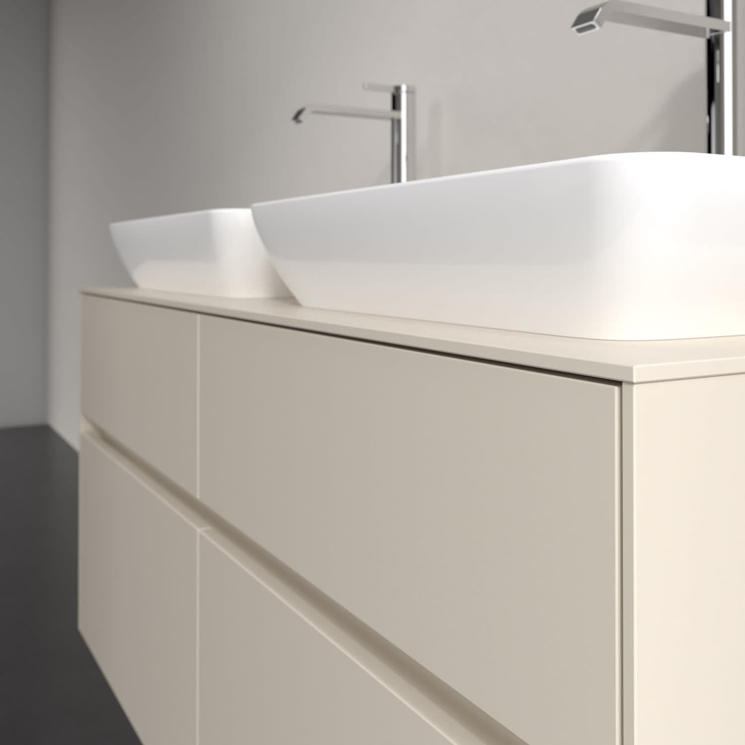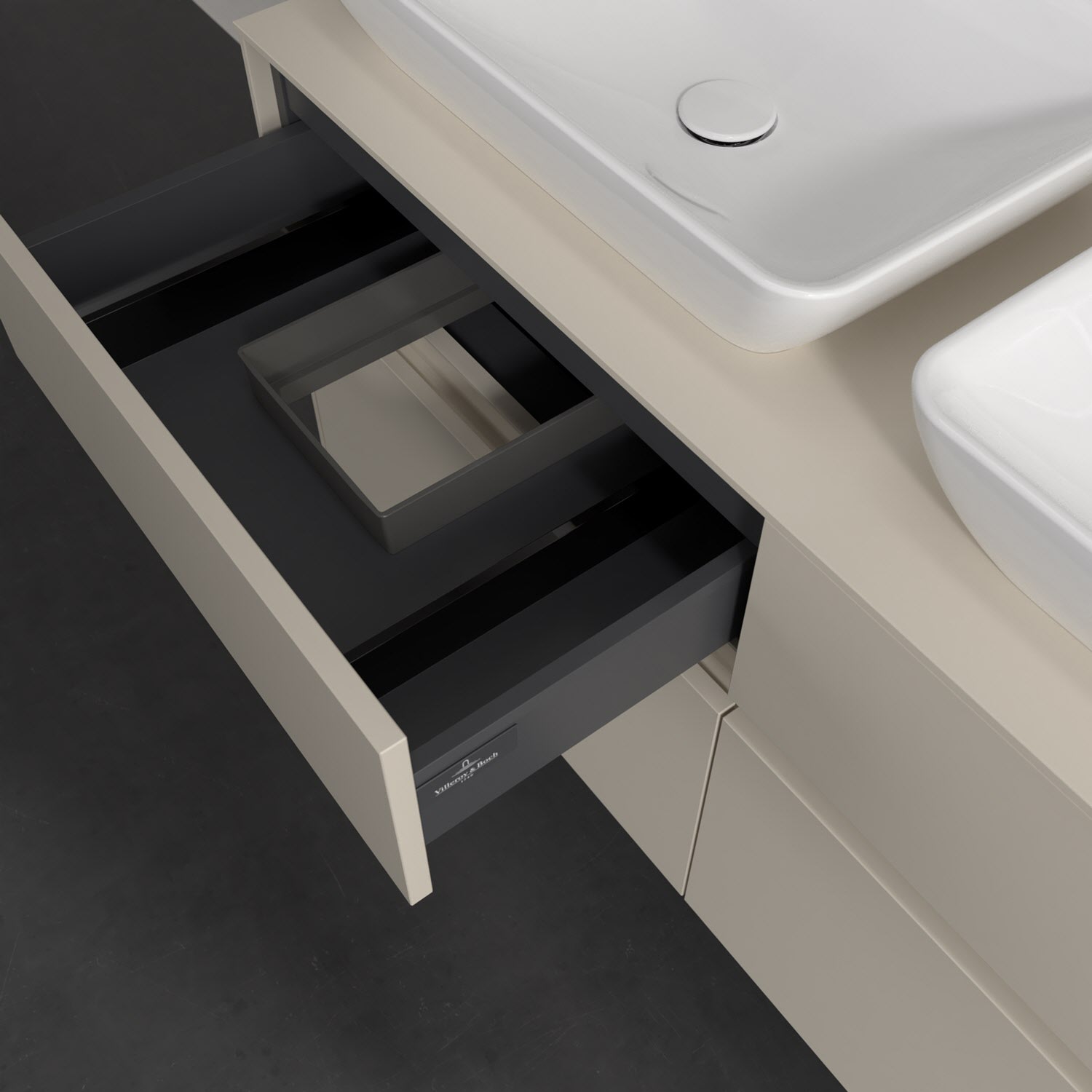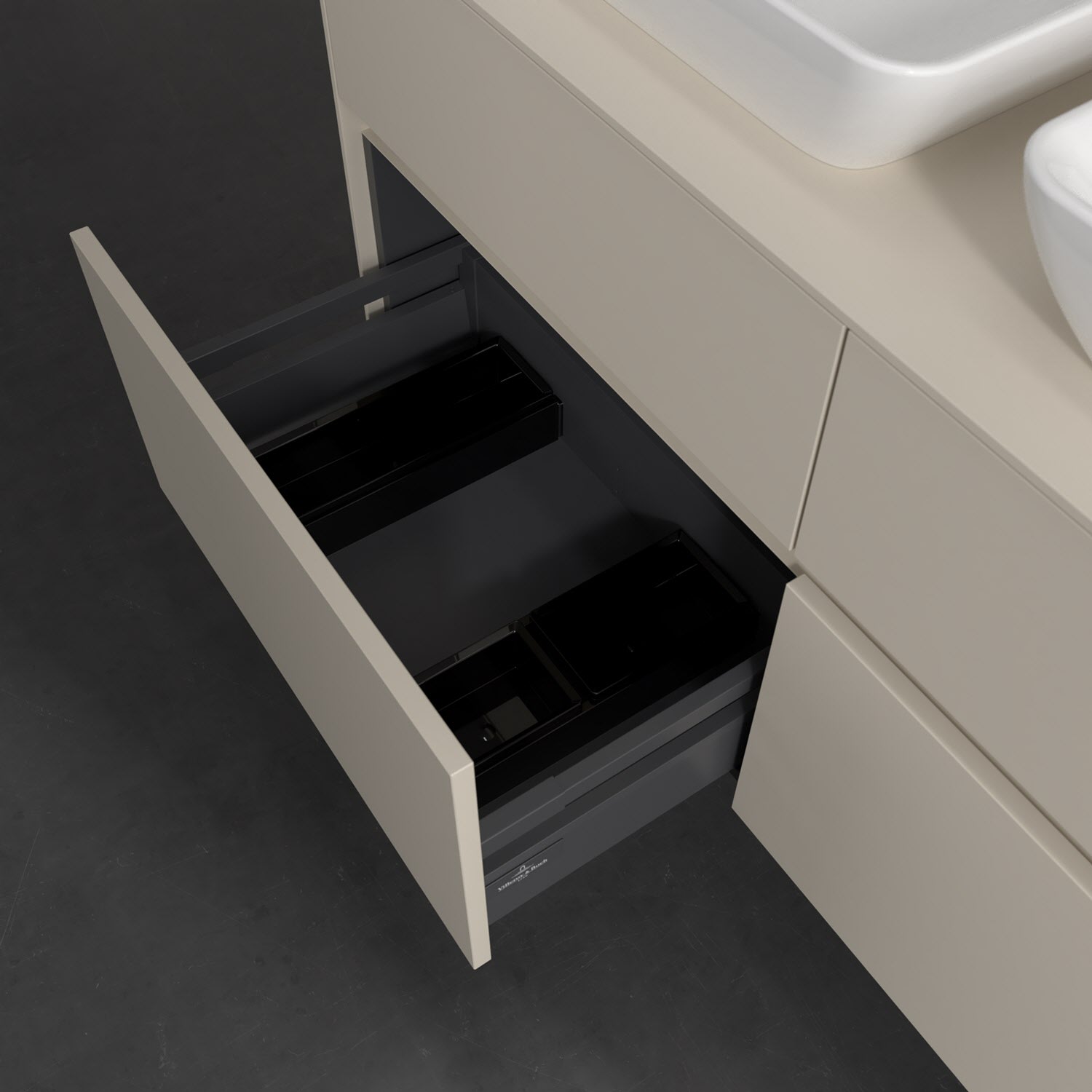 Stauraumwunder im zeitgemäßen Design: Der Villeroy & Boch Waschbeckenunterschrank aus der Collaro Kollektion eignet sich besonders für Familienbäder und bietet genau den Platz, der dort benötigt wird. Stimmungsvolles Highlight der schlichten, modernen Front ist die integrierte Griffmulde mit stufenlos einstellbarer LED-Beleuchtung. Im Inneren bietet das Möbelstück mit vier Auszügen erstaunlich viel Komfort – ermöglicht durch großzügiges Platzangebot und den integrierten Antirutschboden. Variabel setzbare Glasabtrennungen und mitgelieferte Accessory Boxen sorgen für den nötigen Überblick. Dank SoftClosing und Selbsteinzug lassen sich die Auszüge nach der Nutzung lautlos schließen. Die Front ist mit einer hochwertigen Lackierung versehen, deren Anti-Fingerprint-Oberfläche unschönen Fingerabdrücken vorbeugt.
