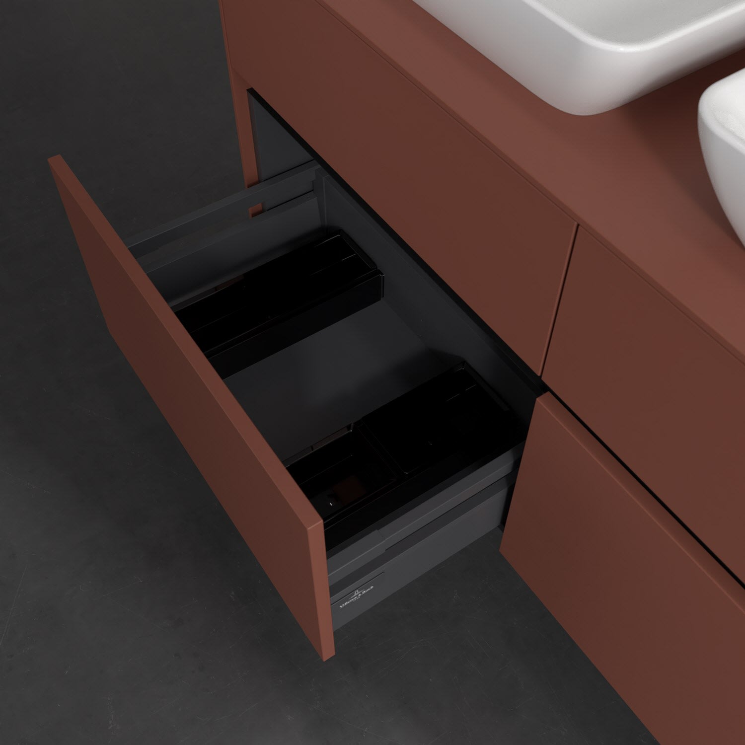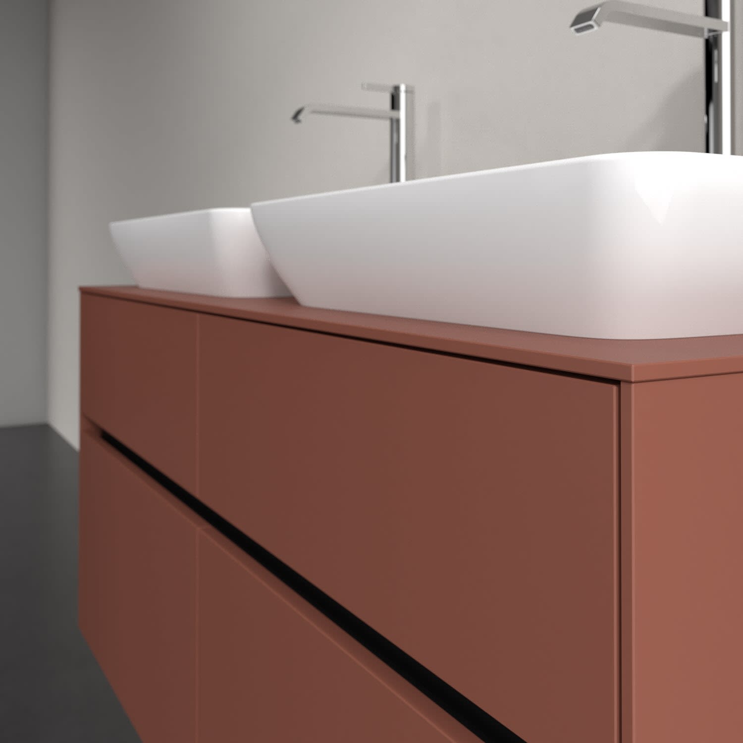 Stauraumwunder im zeitgemäßen Design: Der Villeroy & Boch Waschbeckenunterschrank aus der Collaro Kollektion eignet sich besonders für Familienbäder und bietet genau den Platz, der dort benötigt wird. Stimmungsvolles Highlight der schlichten, modernen Front ist die integrierte Griffmulde mit stufenlos einstellbarer LED-Beleuchtung. Im Inneren bietet das Möbelstück mit vier Auszügen erstaunlich viel Komfort – ermöglicht durch großzügiges Platzangebot und den integrierten Antirutschboden. Variabel setzbare Glasabtrennungen und mitgelieferte Accessory Boxen sorgen für den nötigen Überblick. Dank SoftClosing und Selbsteinzug lassen sich die Auszüge nach der Nutzung lautlos schließen. Die Front ist mit einer hochwertigen Lackierung versehen, deren Anti-Fingerprint-Oberfläche unschönen Fingerabdrücken vorbeugt.