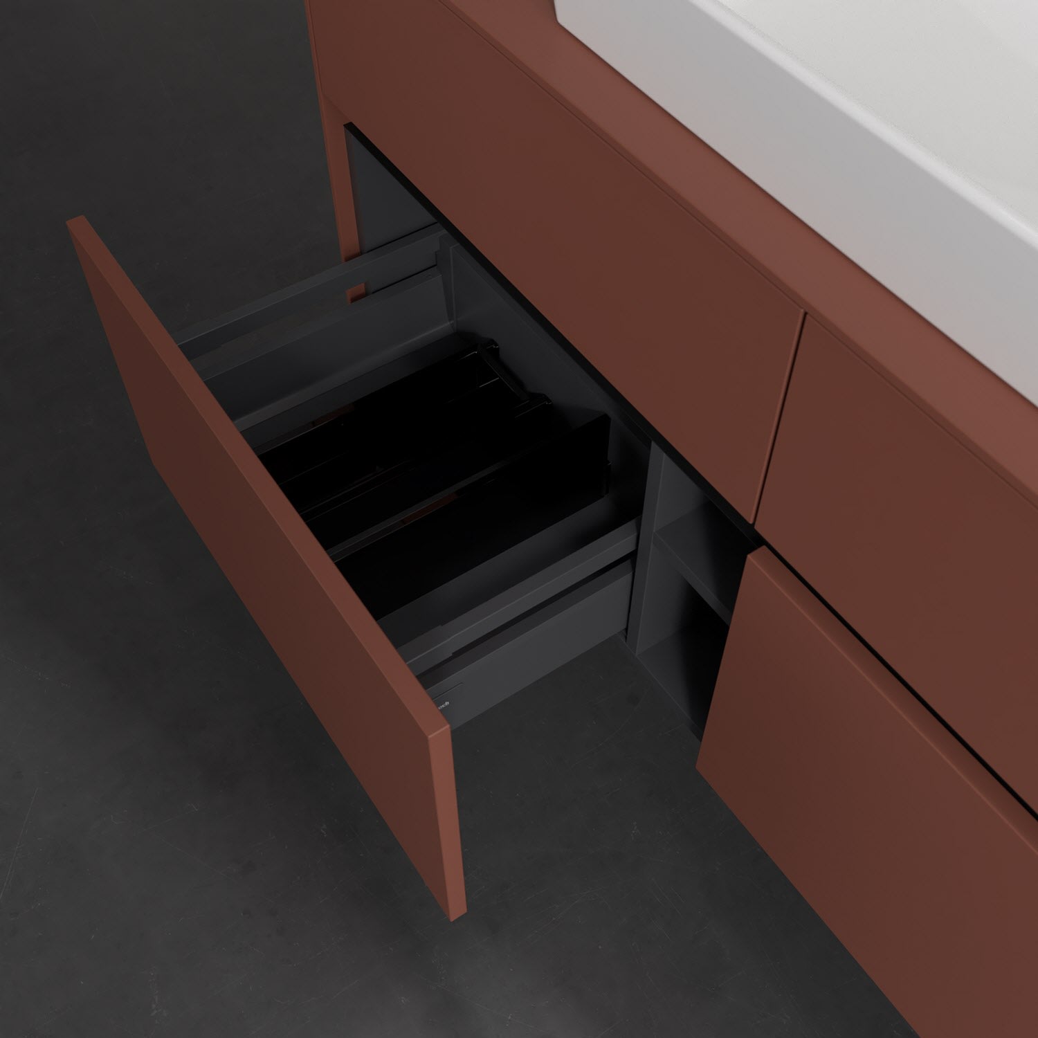 Stauraumwunder im zeitgemäßen Design: Der Villeroy & Boch Waschbeckenunterschrank aus der Collaro Kollektion eignet sich besonders für Familienbäder und bietet genau den Platz, der dort benötigt wird. Stimmungsvolles Highlight der schlichten, modernen Front ist die integrierte Griffmulde mit stufenlos einstellbarer LED-Beleuchtung. Im Inneren bietet das Möbelstück mit vier Auszügen erstaunlich viel Komfort – ermöglicht durch großzügiges Platzangebot und den integrierten Antirutschboden. Variabel setzbare Glasabtrennungen und mitgelieferte Accessory Boxen sorgen für den nötigen Überblick. Dank SoftClosing und Selbsteinzug lassen sich die Auszüge nach der Nutzung lautlos schließen. Die Front ist mit einer hochwertigen Lackierung versehen, deren Anti-Fingerprint-Oberfläche unschönen Fingerabdrücken vorbeugt.