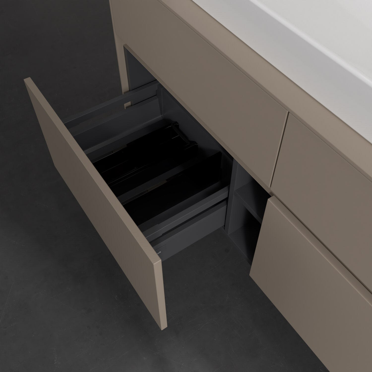 Stauraumwunder im zeitgemäßen Design: Der Villeroy & Boch Waschbeckenunterschrank aus der Collaro Kollektion eignet sich besonders für Familienbäder und bietet genau den Platz, der dort benötigt wird. Stimmungsvolles Highlight der schlichten, modernen Front ist die integrierte Griffmulde mit stufenlos einstellbarer LED-Beleuchtung. Im Inneren bietet das Möbelstück mit vier Auszügen erstaunlich viel Komfort – ermöglicht durch großzügiges Platzangebot und den integrierten Antirutschboden. Variabel setzbare Glasabtrennungen und mitgelieferte Accessory Boxen sorgen für den nötigen Überblick. Dank SoftClosing und Selbsteinzug lassen sich die Auszüge nach der Nutzung lautlos schließen. Die Front ist mit einer hochwertigen Lackierung versehen, deren Anti-Fingerprint-Oberfläche unschönen Fingerabdrücken vorbeugt.