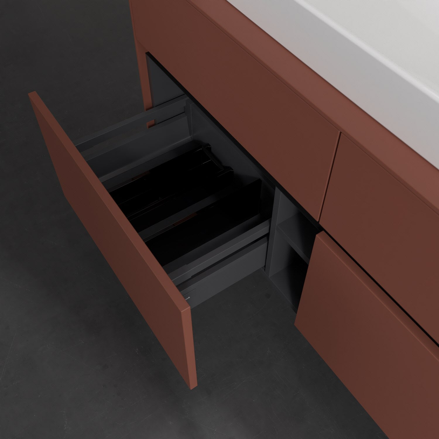 - kein Umfallen oder Verrutschen von Pflegeprodukten in den Schubladen dank rutschhemmendem Boden
