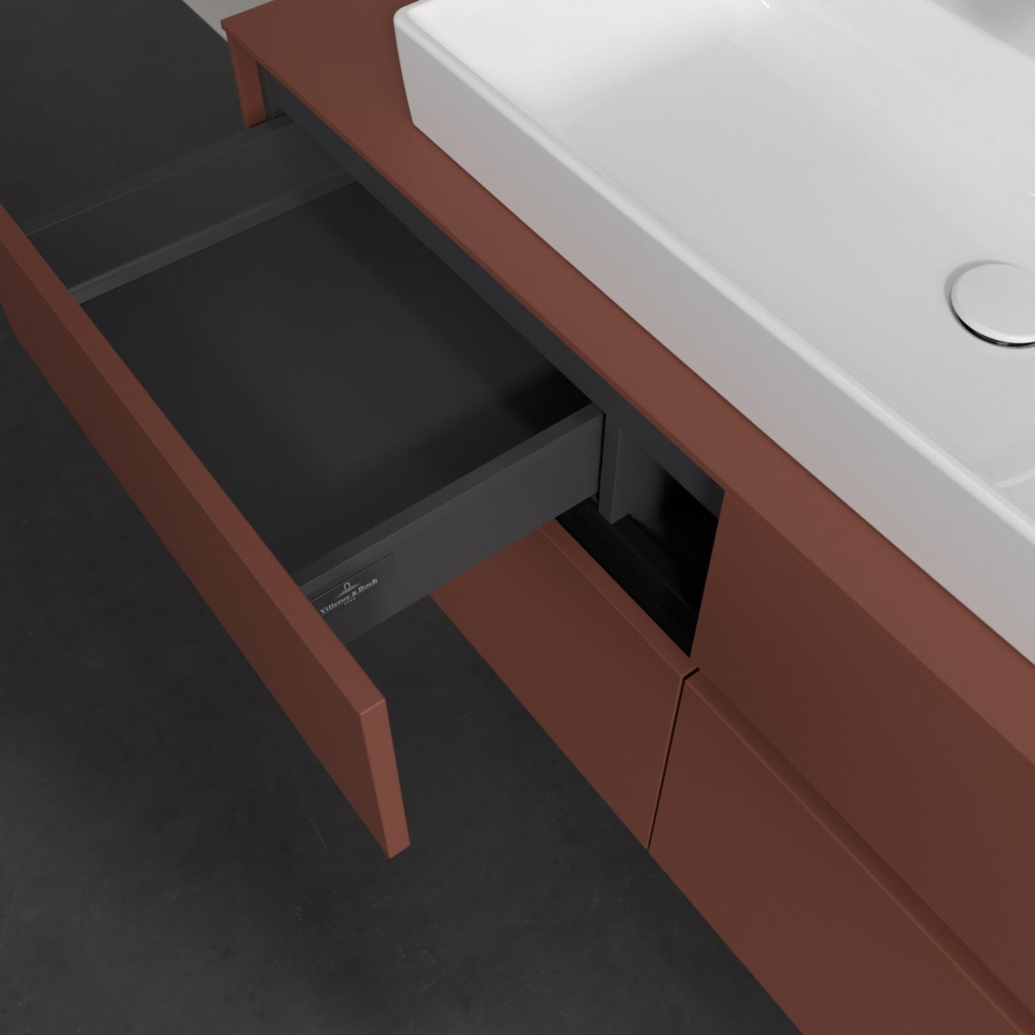 Stauraumwunder im zeitgemäßen Design: Der Villeroy & Boch Waschbeckenunterschrank aus der Collaro Kollektion eignet sich besonders für Familienbäder und bietet genau den Platz, der dort benötigt wird. Stimmungsvolles Highlight der schlichten, modernen Front ist die integrierte Griffmulde mit stufenlos einstellbarer LED-Beleuchtung. Im Inneren bietet das Möbelstück mit vier Auszügen erstaunlich viel Komfort – ermöglicht durch großzügiges Platzangebot und den integrierten Antirutschboden. Variabel setzbare Glasabtrennungen und mitgelieferte Accessory Boxen sorgen für den nötigen Überblick. Dank SoftClosing und Selbsteinzug lassen sich die Auszüge nach der Nutzung lautlos schließen. Die Front ist mit einer hochwertigen Lackierung versehen, deren Anti-Fingerprint-Oberfläche unschönen Fingerabdrücken vorbeugt.