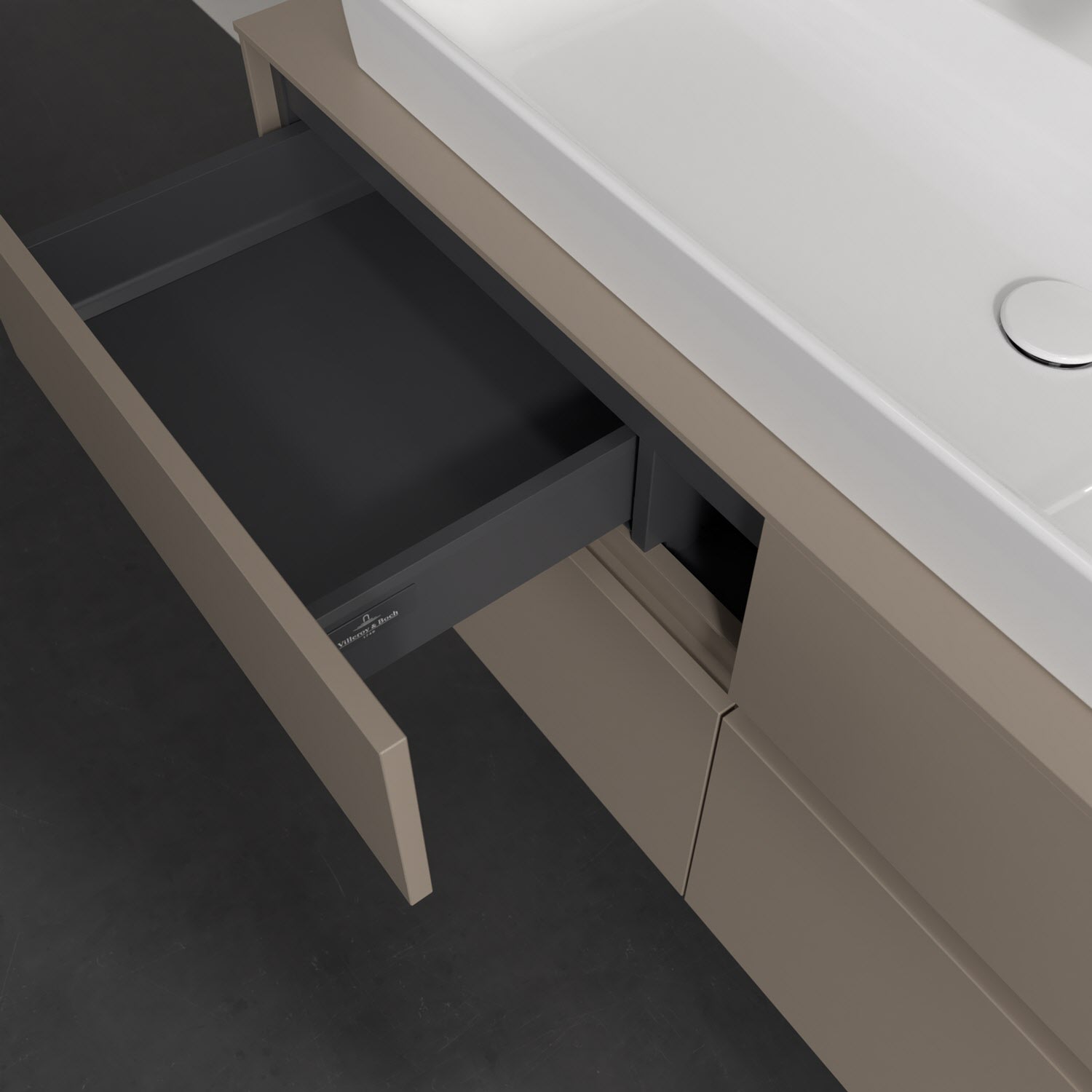 Stauraumwunder im zeitgemäßen Design: Der Villeroy & Boch Waschbeckenunterschrank aus der Collaro Kollektion eignet sich besonders für Familienbäder und bietet genau den Platz, der dort benötigt wird. Stimmungsvolles Highlight der schlichten, modernen Front ist die integrierte Griffmulde mit stufenlos einstellbarer LED-Beleuchtung. Im Inneren bietet das Möbelstück mit vier Auszügen erstaunlich viel Komfort – ermöglicht durch großzügiges Platzangebot und den integrierten Antirutschboden. Variabel setzbare Glasabtrennungen und mitgelieferte Accessory Boxen sorgen für den nötigen Überblick. Dank SoftClosing und Selbsteinzug lassen sich die Auszüge nach der Nutzung lautlos schließen. Die Front ist mit einer hochwertigen Lackierung versehen, deren Anti-Fingerprint-Oberfläche unschönen Fingerabdrücken vorbeugt.