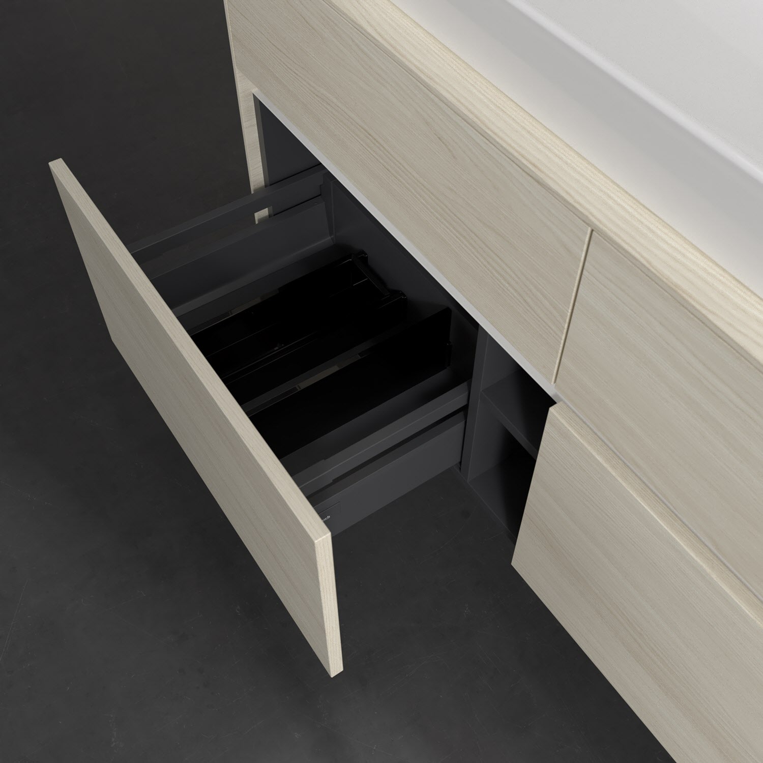 - kein Umfallen oder Verrutschen von Pflegeprodukten in den Schubladen dank rutschhemmendem Boden